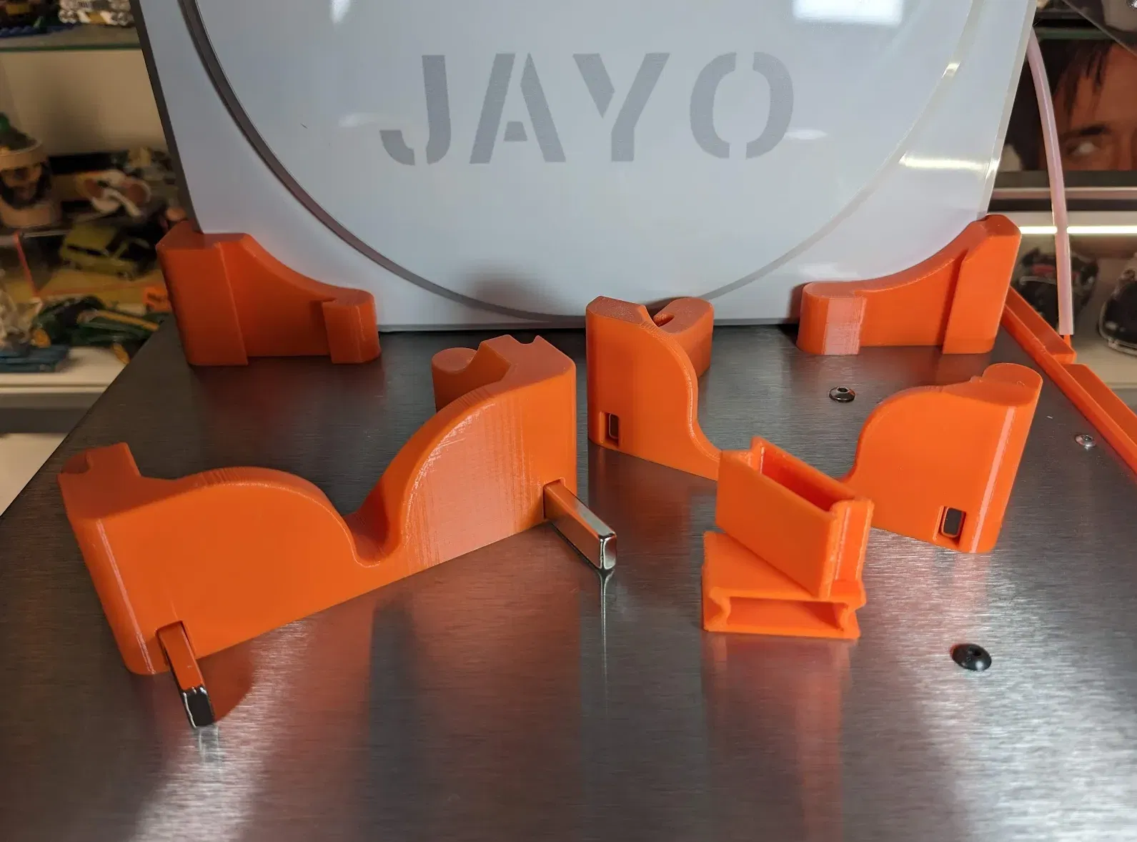 Tui dự định đặt ít nhất hai máy sấy filament trên nóc tủ máy in của tui, nhưng tui muốn có cách nào đó để chắc chắn là chúng không bị xô ngã được. Vì vậy tui đã chế tạo mấy cái bracket giữ mấy cái máy sấy bằng sức mạnh của nam châm.