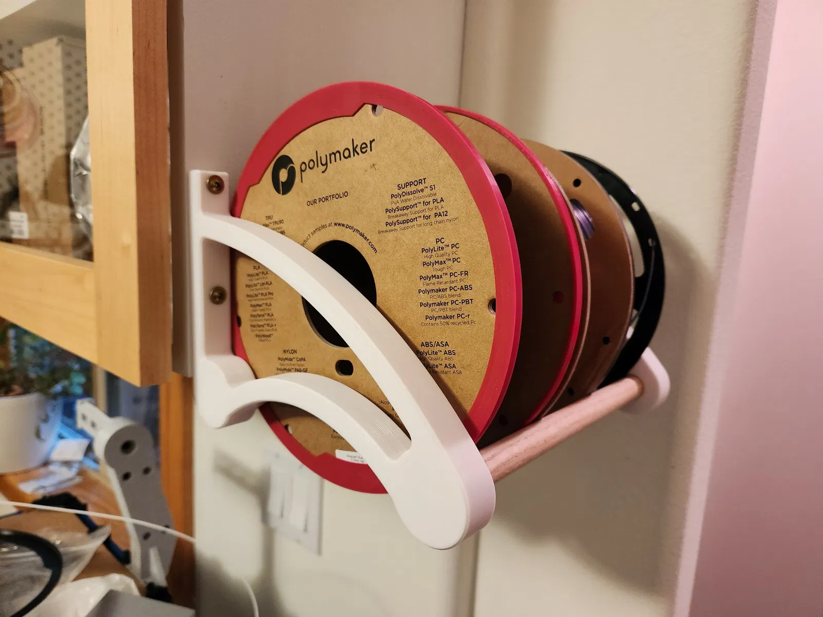 Kệ đựng filament đơn giản. Cần hai đoạn gỗ tròn và bốn ốc #8/4.5mm để lắp đặt. Tôi đã dùng ốc 1" để lắp vào ván ép ¾".