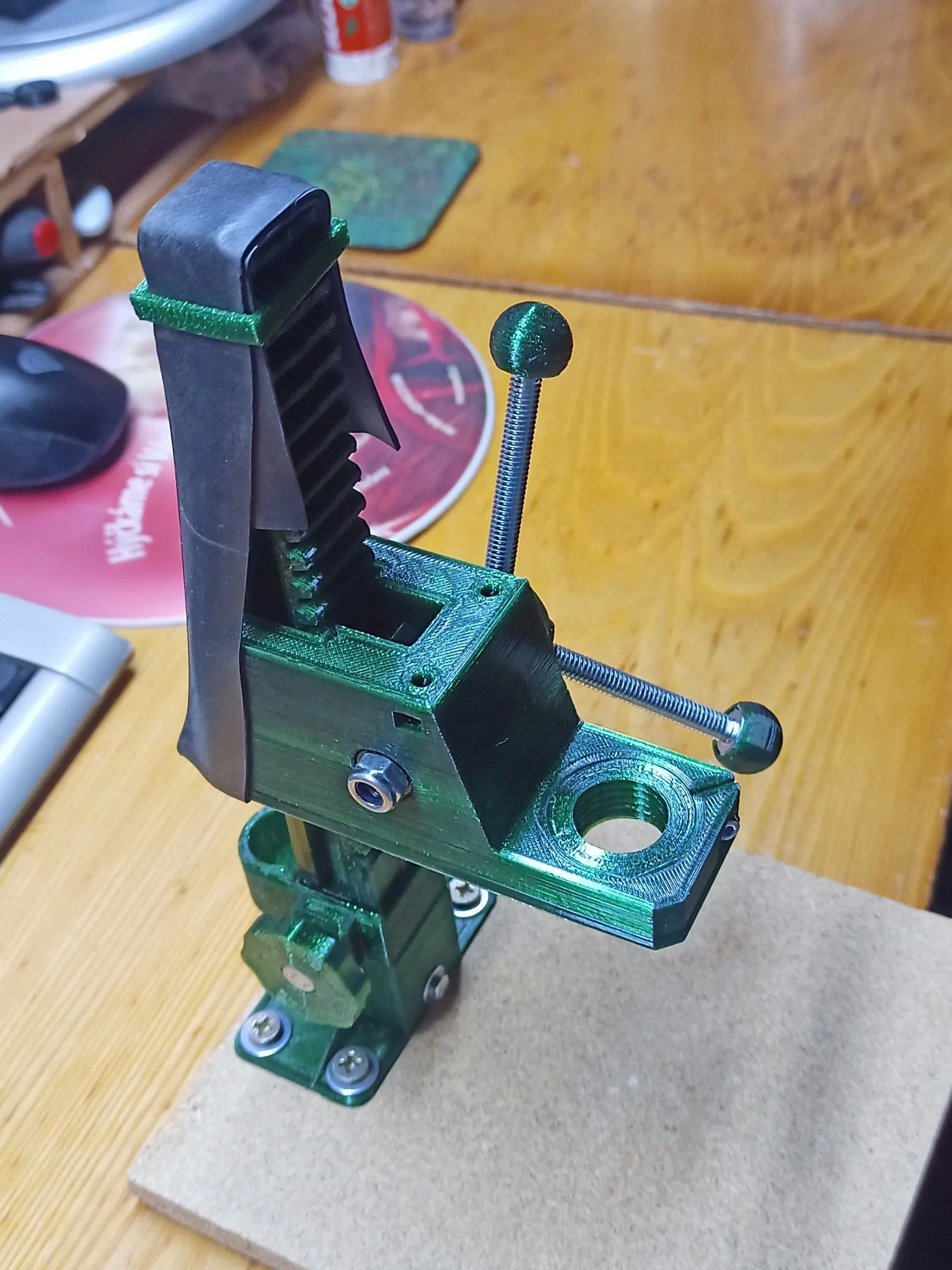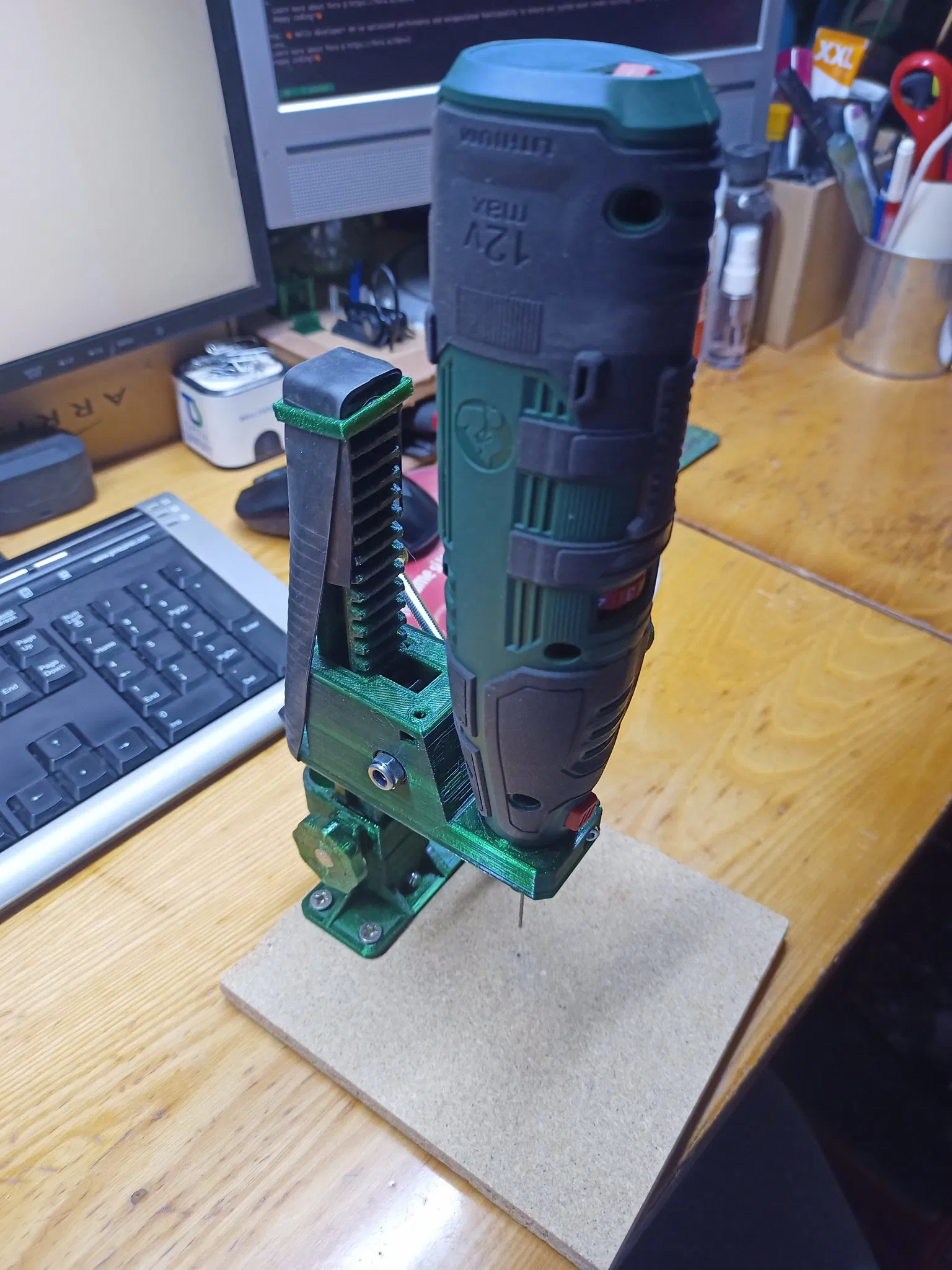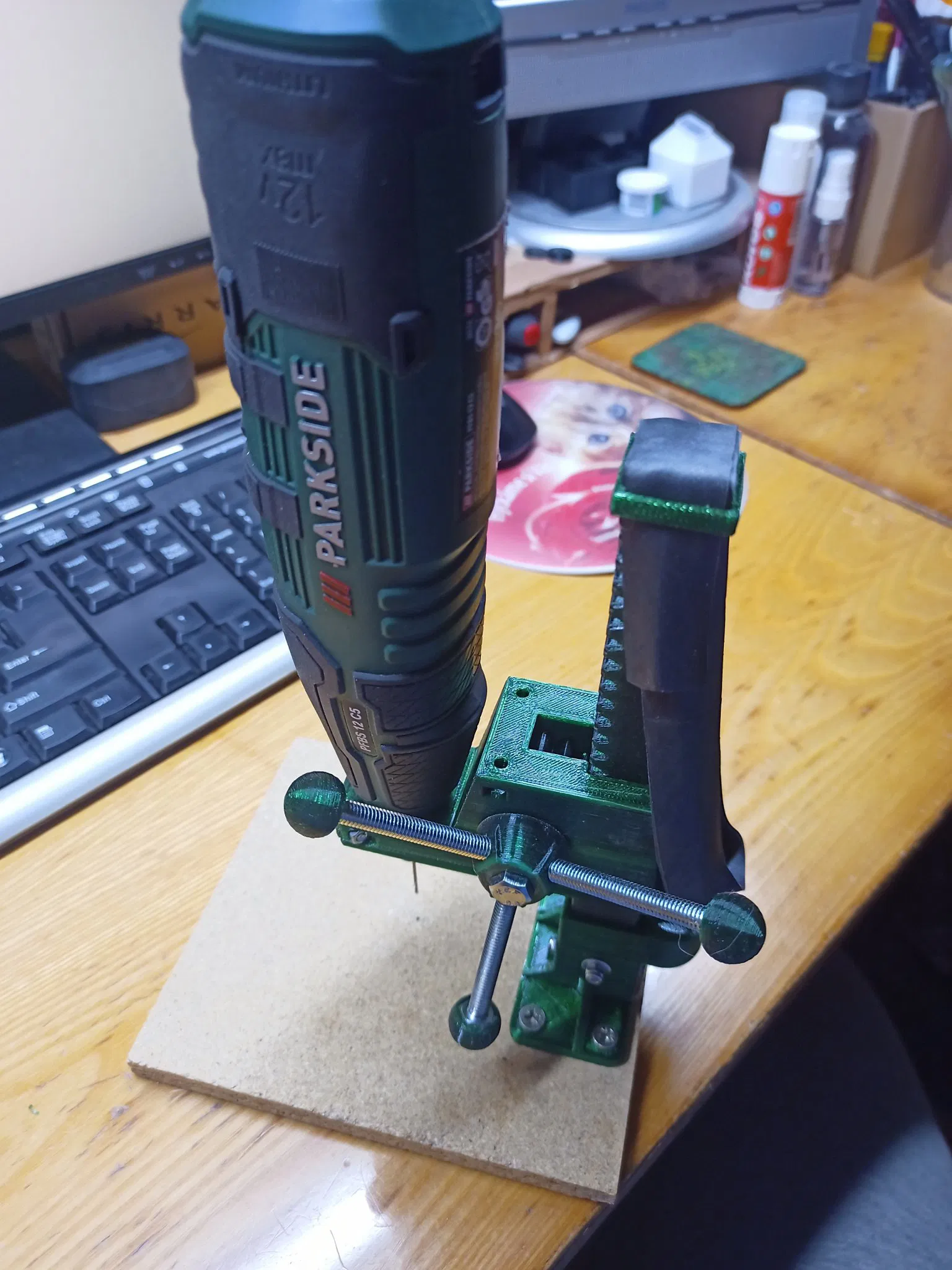 Tôi còn dư ván dăm nên không in phần đế, mà tùy chỉnh lại phần giá đỡ để gắn lên bàn. Máy Parkside có thể khoan tới mặt bàn của tui. Nếu không thì phải rút ngắn cột máy lại.