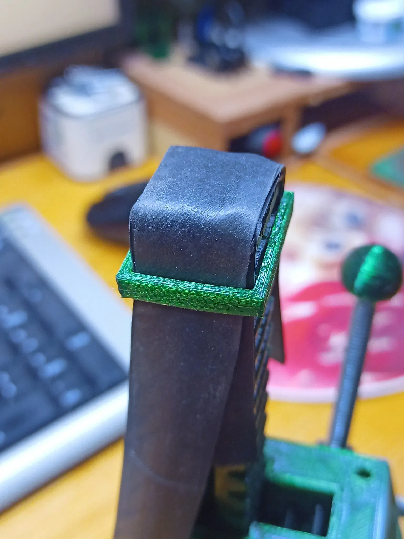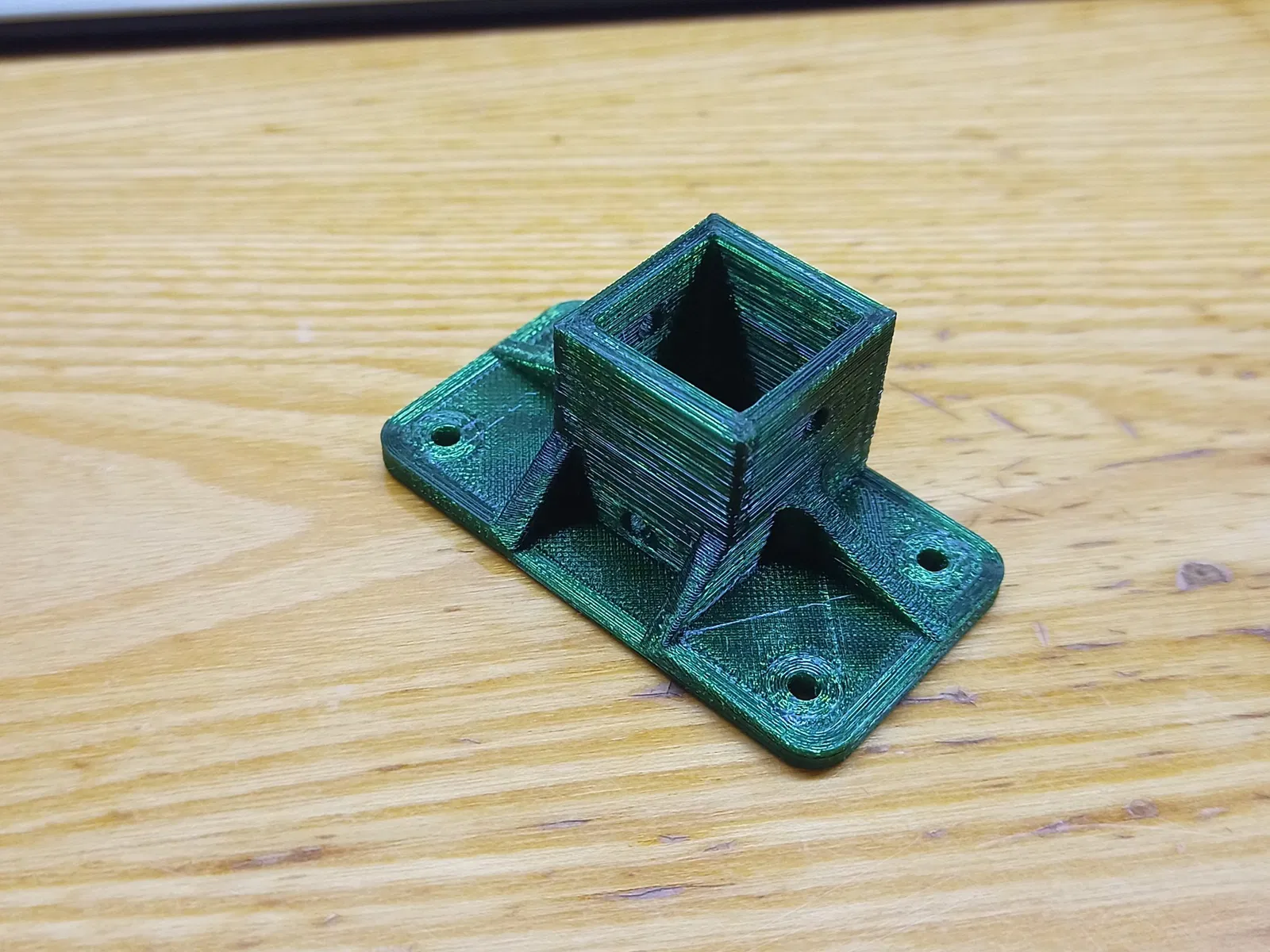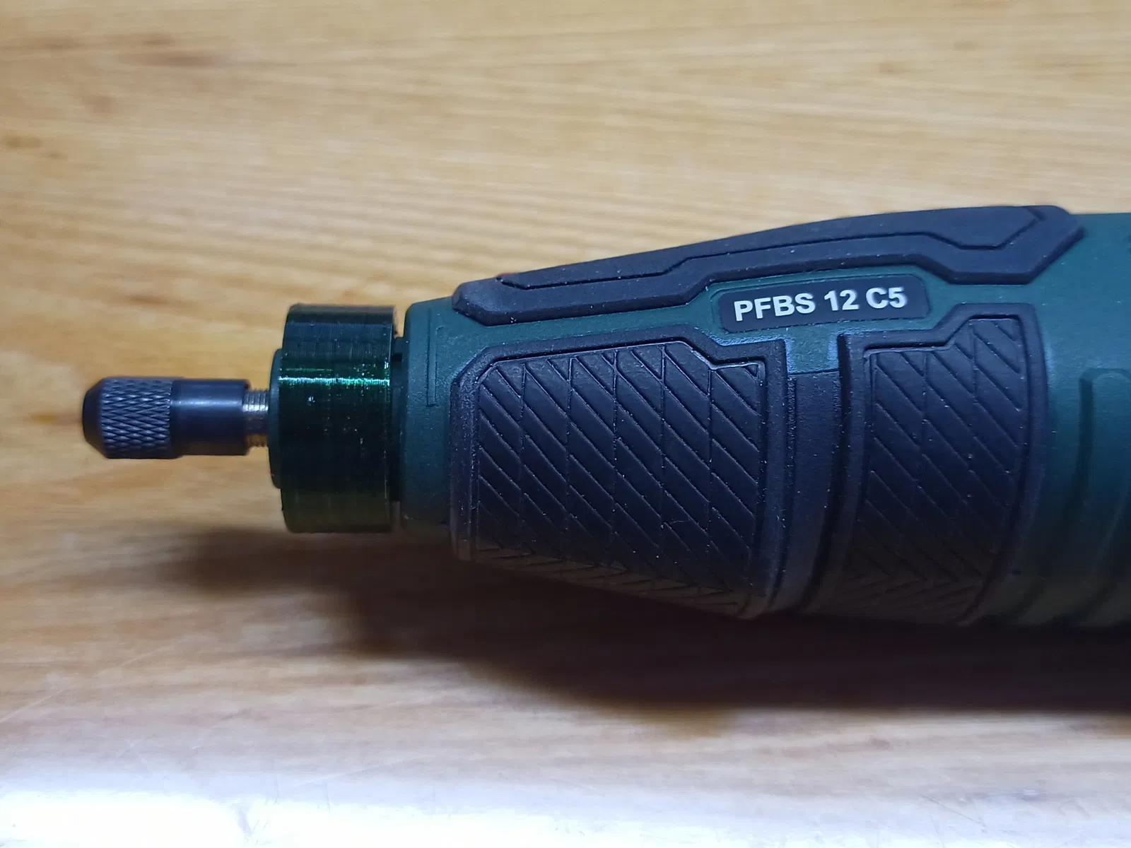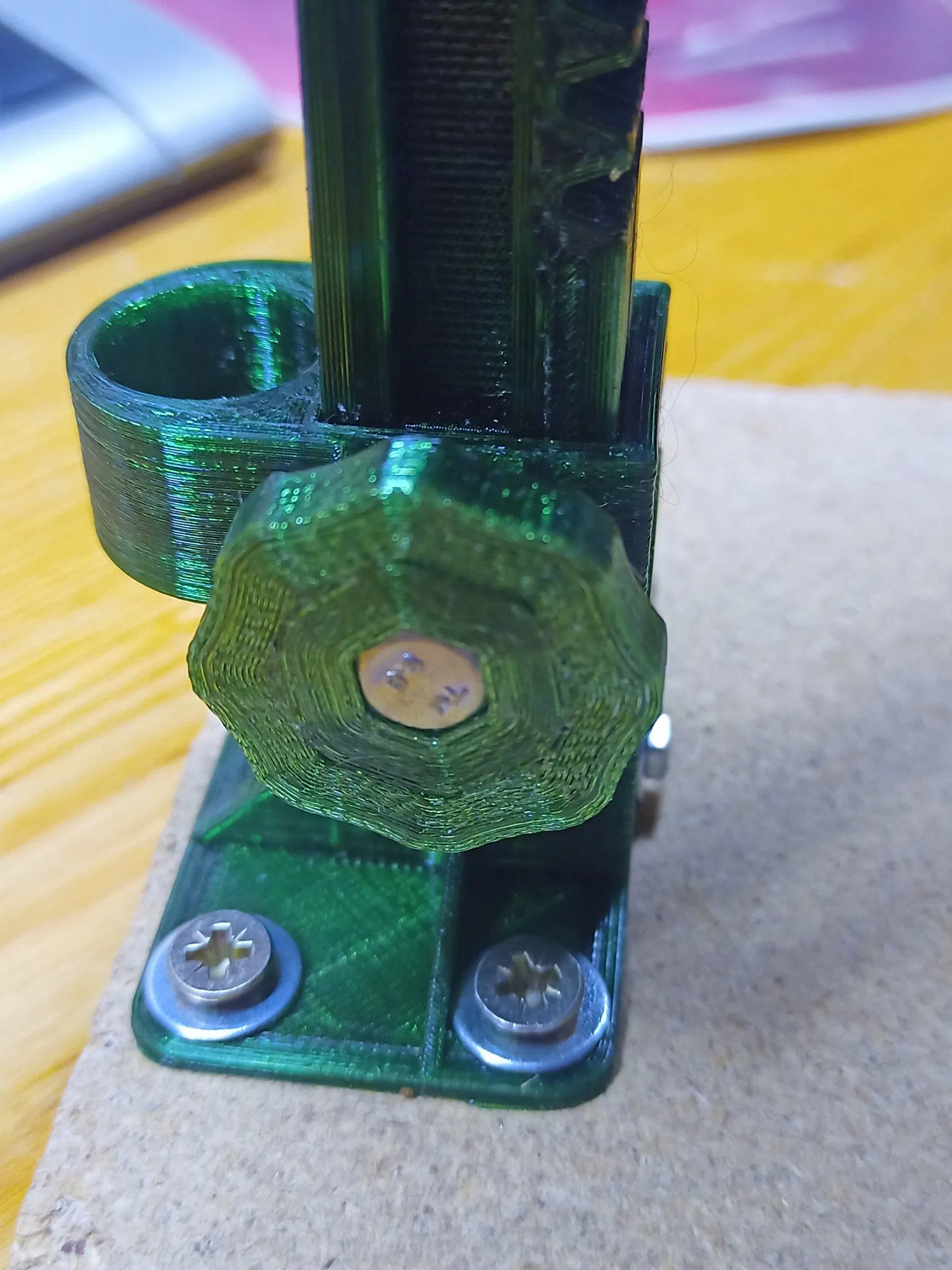 Tôi còn dư ván dăm nên không in phần đế, mà tùy chỉnh lại phần giá đỡ để gắn lên bàn. Máy Parkside có thể khoan tới mặt bàn của tui. Nếu không thì phải rút ngắn cột máy lại.