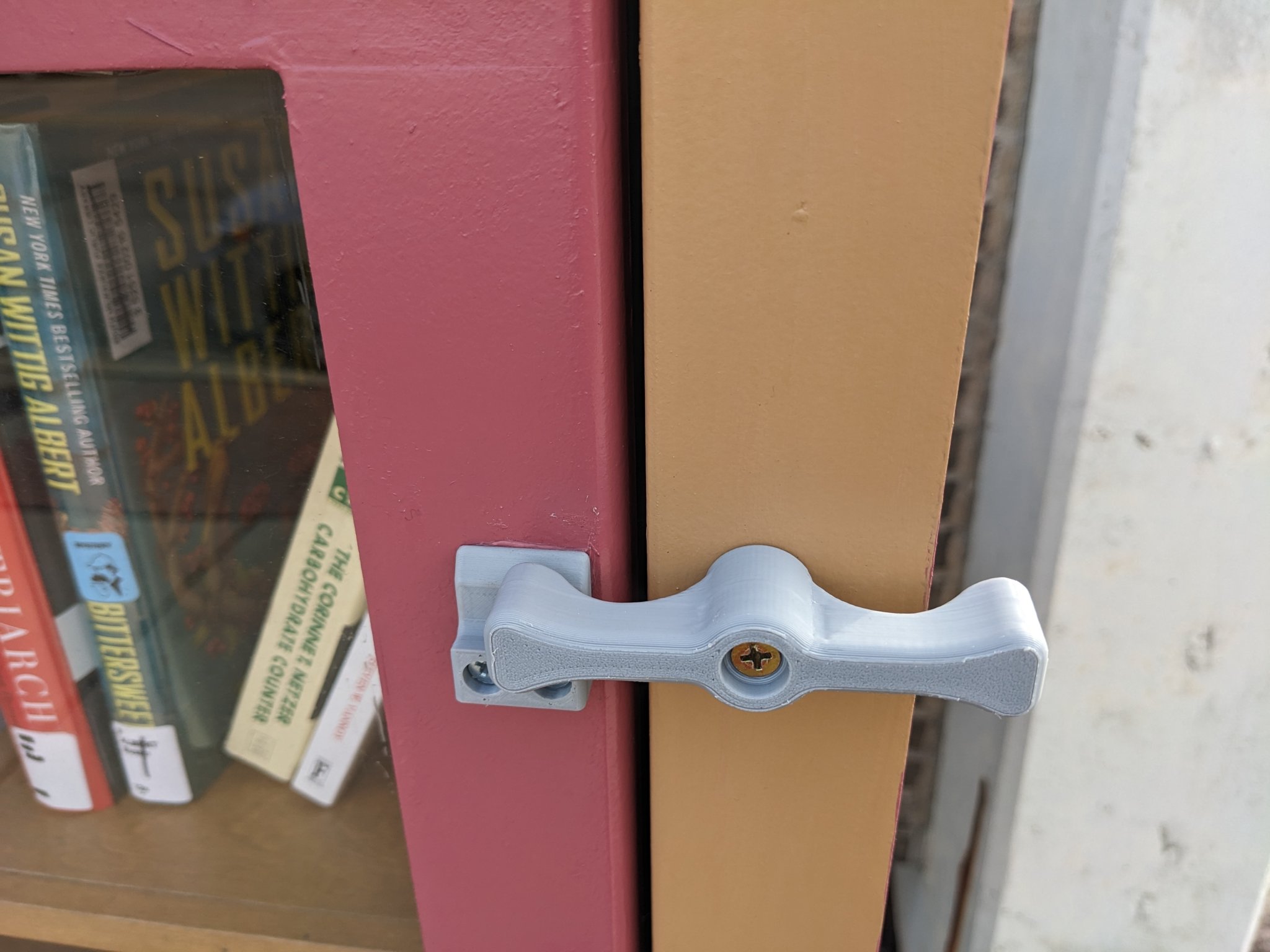 Tui có tân trang lại cái tủ sách chia sẻ cộng đồng ở bên ngoài thư viện công cộng của địa phương. Tui đã thay cái chốt gỗ xoay đơn giản bằng cái chốt in 3D, nó chắc chắn hơn một chút.