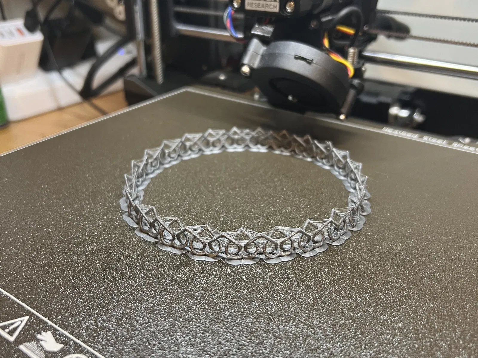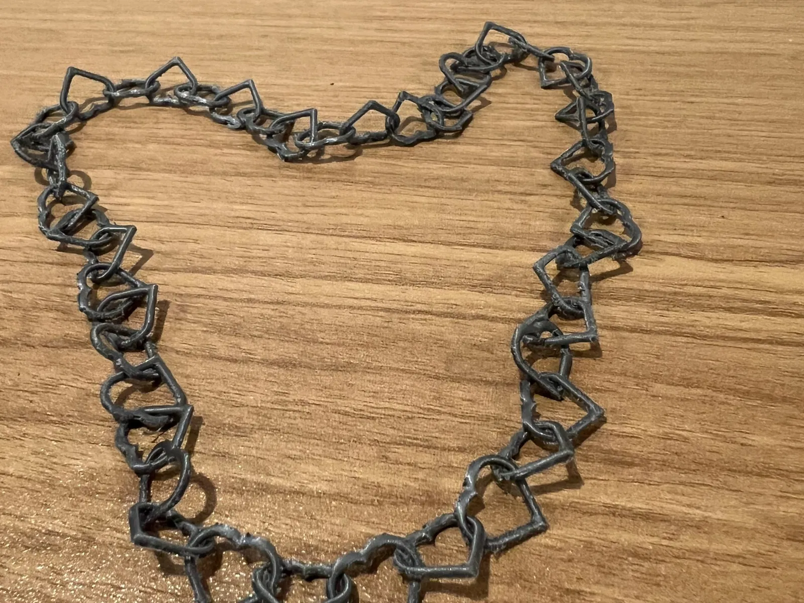 Dây chuyền hoặc vòng tay mắt xích trái tim in liền một khối. Có sẵn các phiên bản đường kính 100mm và 200mm. In với brim và tháo cẩn thận. Dùng súng nhiệt xử lý các sợi nhựa thừa.