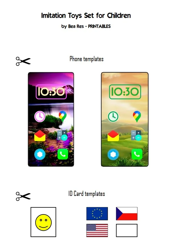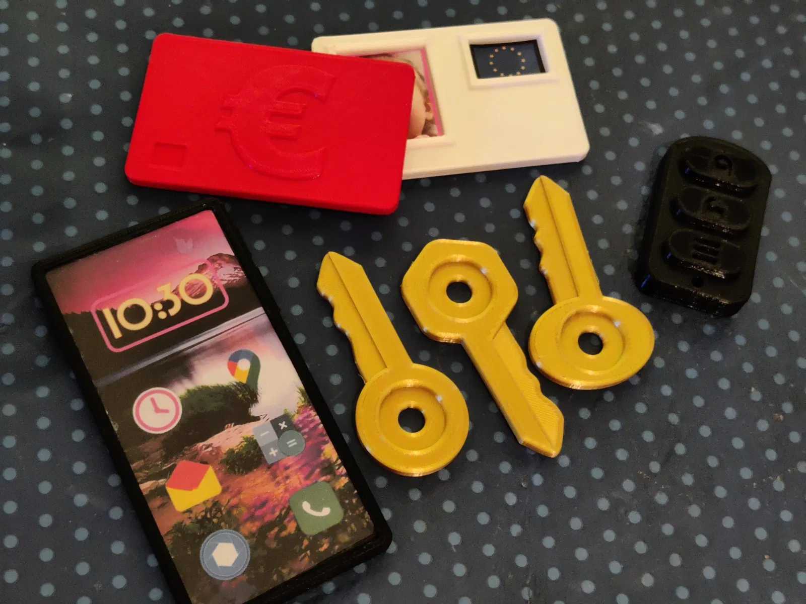 Bộ đồ chơi gồm chìa khóa, điện thoại, remote xe và thẻ ID, giúp bé bắt chước ba mẹ. Sản phẩm in 3D dễ dàng, an toàn cho trẻ nhỏ, không cần support, bo tròn các cạnh. Kích thước đa dạng cho bé vui chơi.