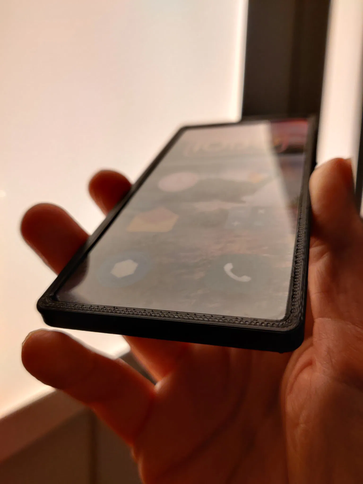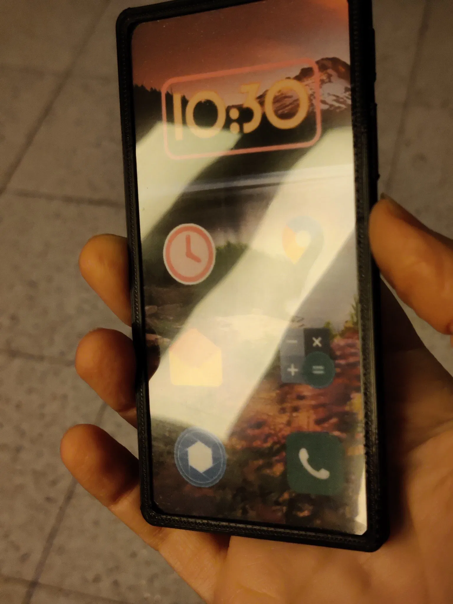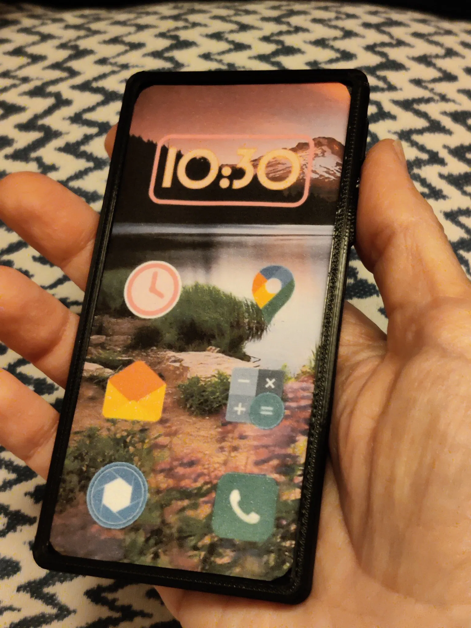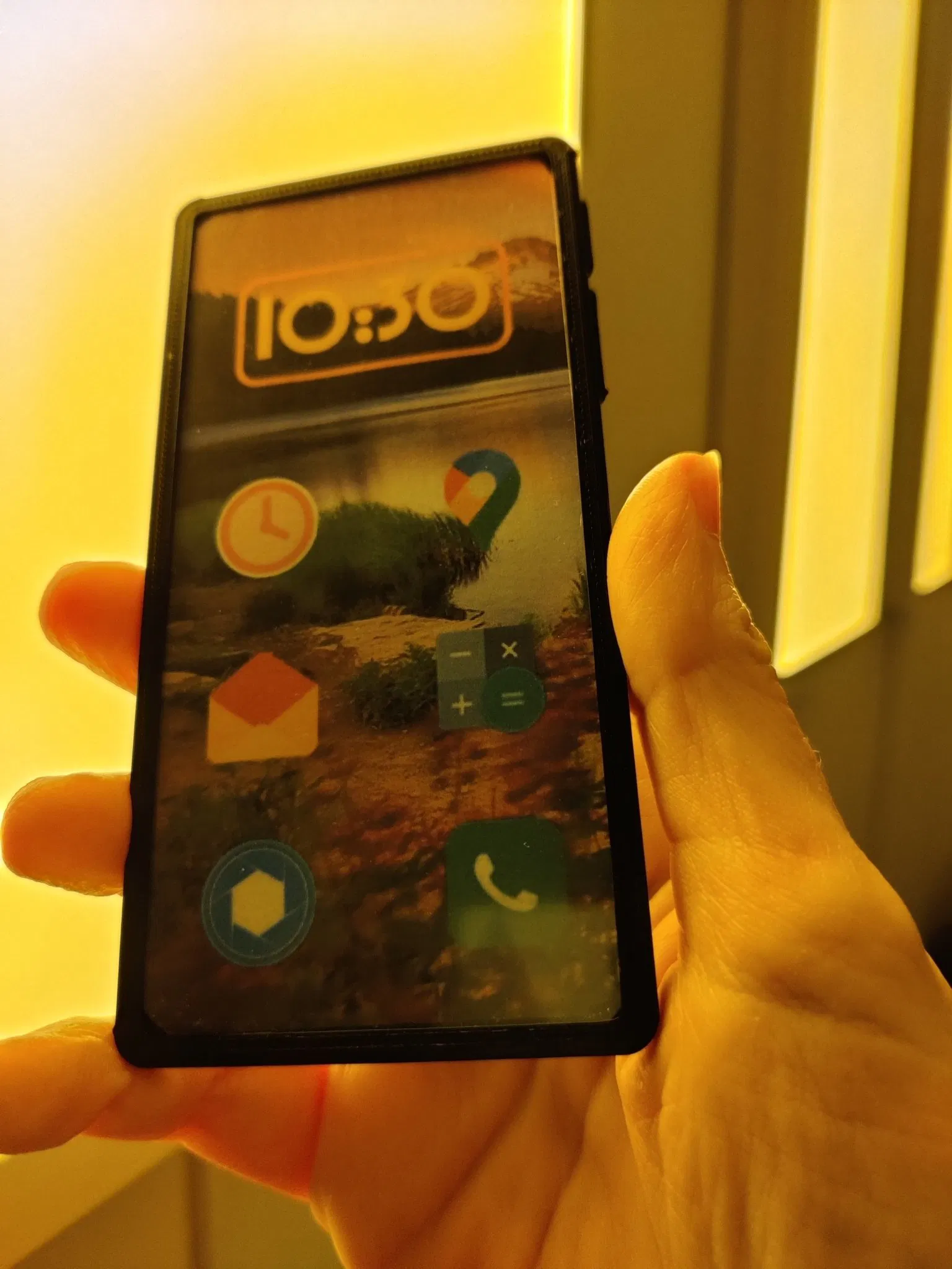 Cái điện thoại có nút bấm và khe sạc, tui có đính kèm một mẫu PDF để in ra giấy mô phỏng màn hình. Nếu bạn có một tấm nhựa trong, hoặc cái bao bì nhựa trong suốt, bạn có thể cắt một miếng hình chữ nhật đúng kích cỡ mẫu giấy đó và gắn vào điện thoại để làm màn hình kính.