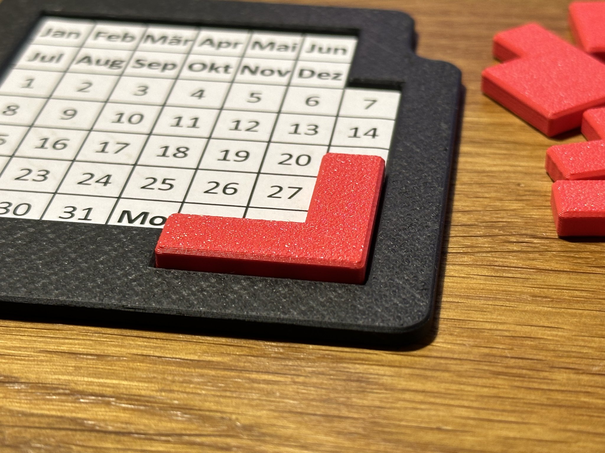 Phiên bản chỉnh sửa của "Pentomino Calender" từ abekabakoff. Các quân cờ và khung lịch được thay đổi chiều cao, cho phép in các ngày theo dạng 2D. Một cách sáng tạo để đếm ngày bằng 3D printing.