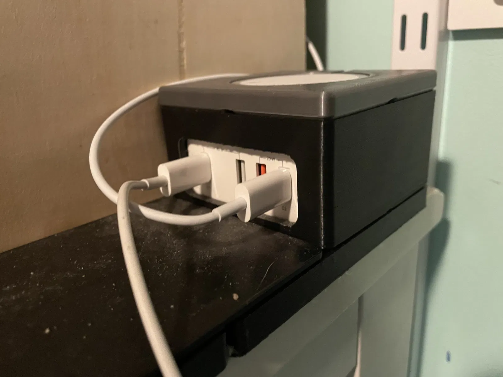 Một khay Gridfinity có thể xếp chồng lên nhau, dùng để đựng cục sạc. Thiết kế này phù hợp với cục sạc 65W USB, nhưng bạn hoàn toàn có thể thử nghiệm với các loại sạc có kích thước tương đương.