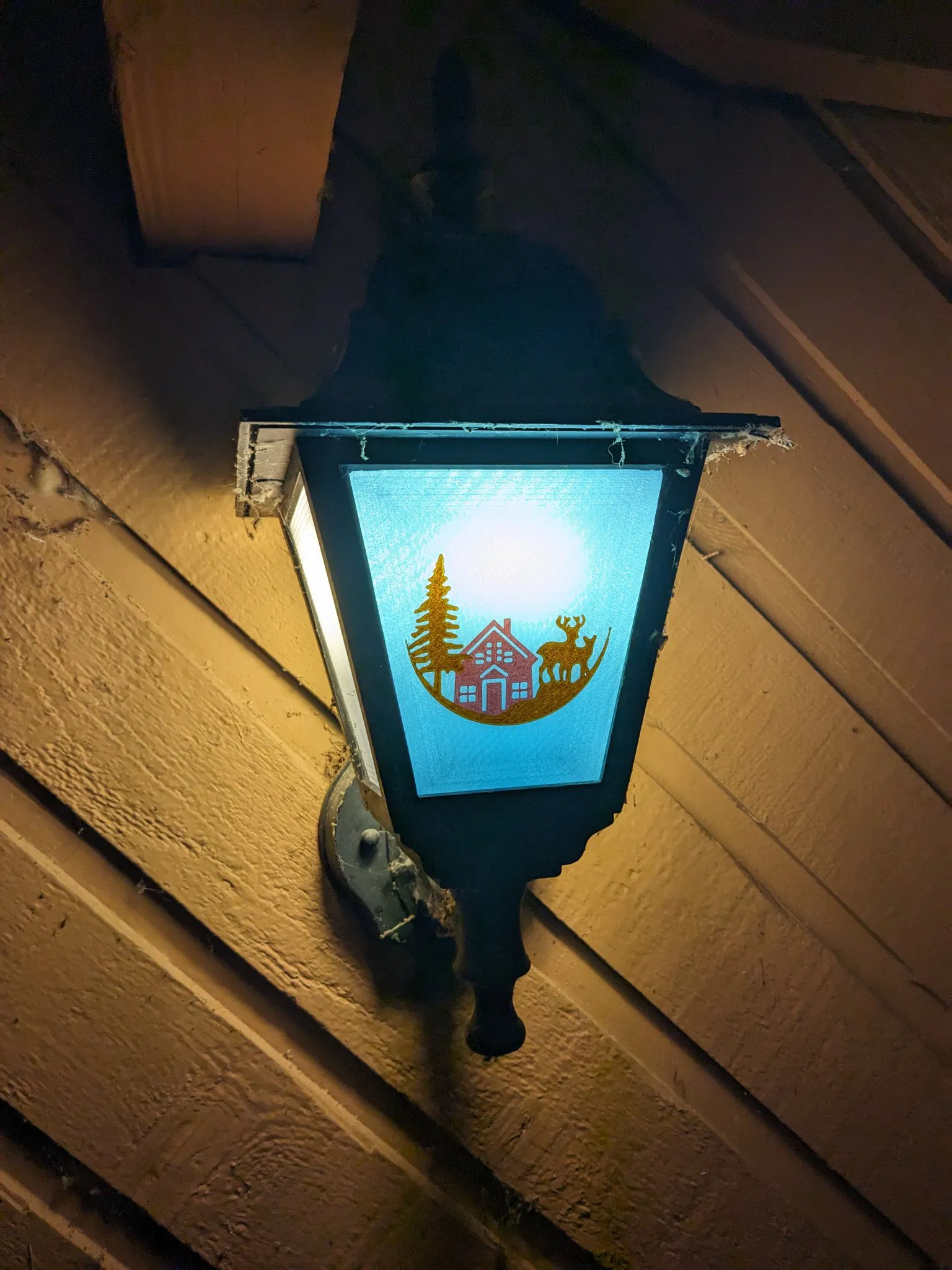 Cách in - dùng file .3MF đi kèm - file này bao gồm hai mô hình khác nhau - tấm kính đèn hiên và bản thiết kế. Nếu bạn cần thay đổi kích thước tấm kính đèn hiên để vừa với kích thước của riêng bạn, bạn không cần phải làm biến dạng hình dạng vì nó là một “file” riêng biệt trong định dạng file .3mf phức tạp. Với hiệu ứng được chụp ảnh, tôi đã in hai lớp đầu tiên bằng nhựa trong màu xanh lam, sau đó cắt sợi và để cảm biến hết sợi nhắc nhở tôi. Phần lớn bản in là sợi nhựa trong - truyền sáng tốt. Khuyến nghị 30% infill dạng gyroid, 2 lớp vỏ, chiều cao lớp 0.2mm. Cắt lát ở hai lần thay đổi màu cuối cùng để có màu nhà và màu cây/hươu nai. Hãy nhớ, với ánh sáng, màu sắc là cộng dồn - vì vậy đỏ và xanh lam sẽ tạo ra màu tím. Trong ví dụ, tôi đã sử dụng màu đỏ cho lớp nhà (cũng là lớp bên dưới cây và hươu nai) và sau đó phủ một lớp màu xanh lá cây trong mờ. mắt bạn không thể nhận thức được sự kết hợp đỏ-xanh lá cây, vì vậy bạn sẽ thấy một màu nâu vàng.