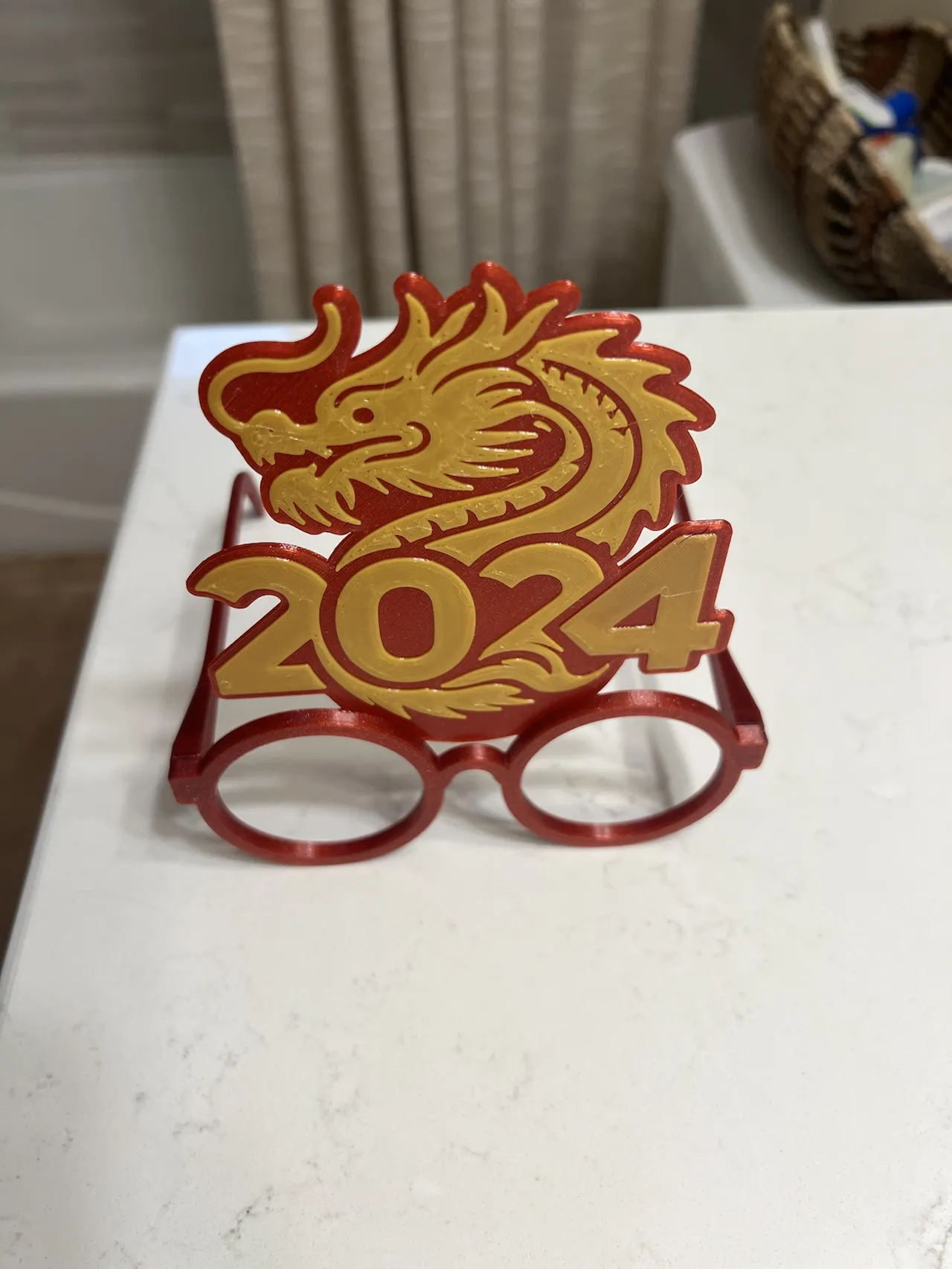 Welcome the year 2024 with these Dragon Glasses! This 3D model is inspired by the Chinese zodiac sign of the dragon, a symbol of power, strength, and good luck. The glasses have a yellow dragon on a red background on top of the frames, creating a striking contrast. The eyes are cut out, allowing you to see through them. The glasses are a quick print that works in multiple colors, and a pre-colored version is provided.