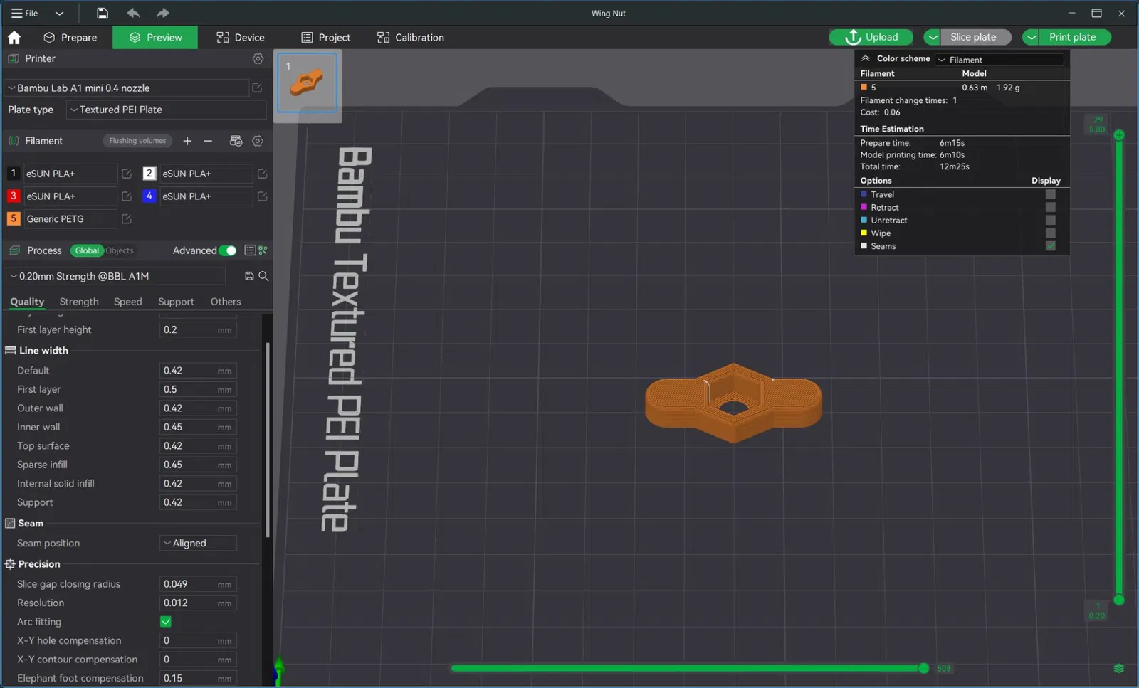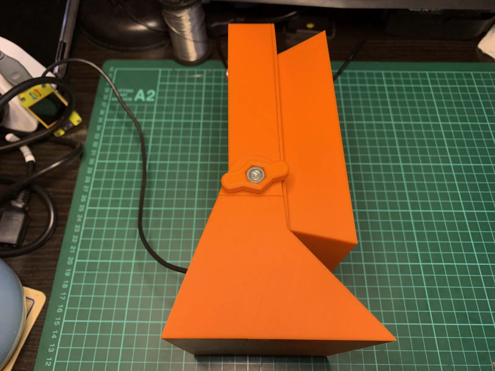 Giải pháp đơn giản của tui cho nhu cầu ốc cánh bướm là in 3D một cái bộ phận để lồng vào con ốc M6 hiện có, tạo ra mấy cái "cánh" để siết ốc bằng tay. Màu của bộ phận in 3D này cũng hợp với màu của dự án trước đó luôn. Có một lớp in mỏng trên bộ phận in 3D để gắn vào phía bu lông của con ốc, giúp giữ chặt bộ phận cánh bướm lại. Lớp mỏng này chỉ dày 0.2mm, nên không cần nhiều chiều dài bu lông lắm.