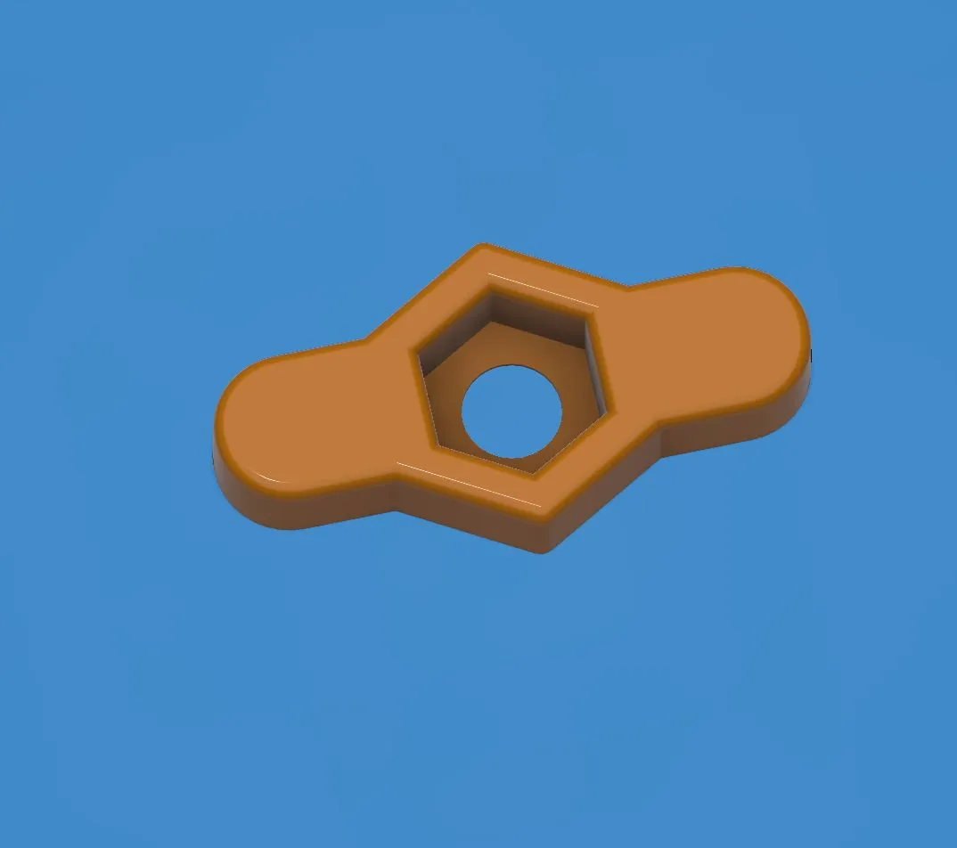 Ốc bướm cánh cho ốc M6. Tui đã tạo ra một bộ phận in 3D để lồng vào ốc M6, tạo cánh để siết ốc bằng tay, giải quyết vấn đề ốc lỏng trong dự án trước. Bộ phận này có lớp lót 0.2mm và không cần hỗ trợ in.