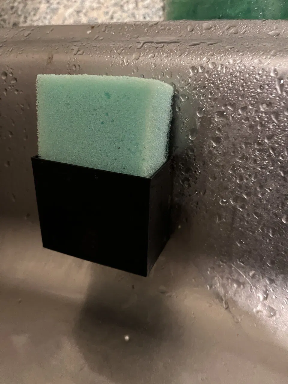 Giá đỡ miếng bọt biển đặt gọn trong bồn rửa, có lỗ thoát nước. Yêu cầu nam châm để cố định. Kích thước phù hợp cho miếng bọt biển lên tới 85x55x25mm. In không cần hỗ trợ, chỉ cần tạm dừng để đặt nam châm.