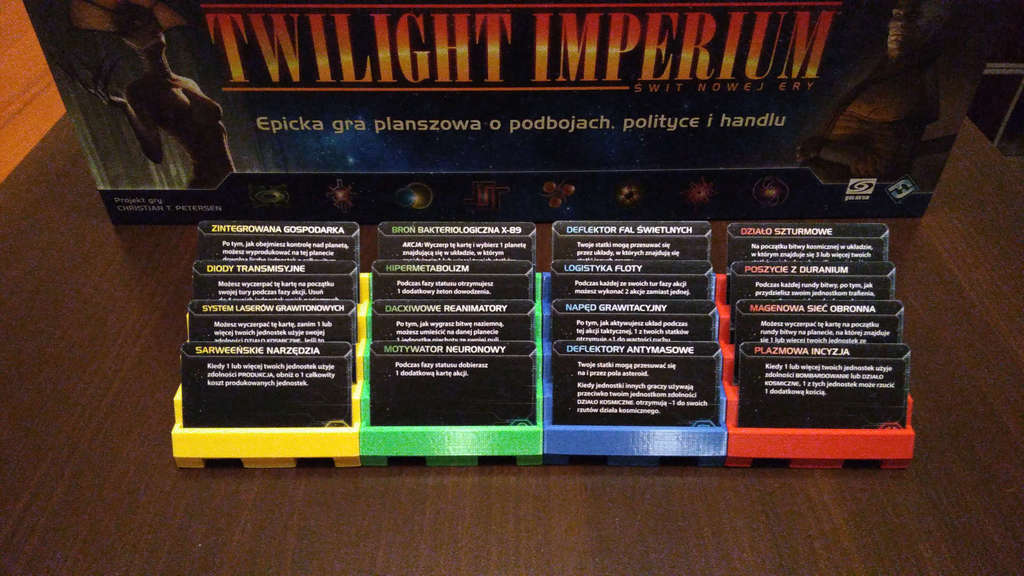Một giá đỡ mô-đun cho thẻ công nghệ từ trò chơi cờ bàn Twilight Imperium, phiên bản thứ 4. Sản phẩm giúp tiết kiệm không gian và giữ cho thẻ công nghệ của bạn luôn gọn gàng, dễ tiếp cận.