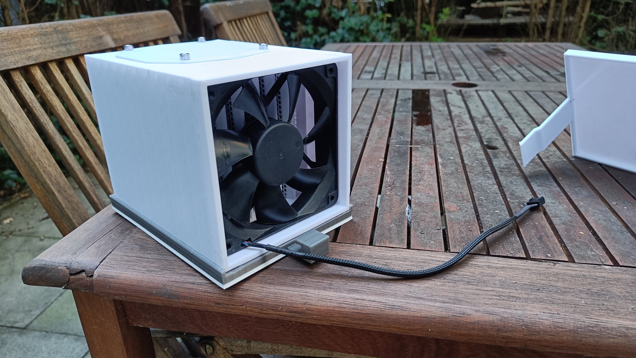 Hướng dẫn: In tất cả các bộ phận một lần, ngoại trừ nắp đầu. In cái đó hai lần. Gắn quạt 120mm lên phần lưới nhọn bằng cách sử dụng các vít nhỏ đi kèm. Vặn chúng vào quạt và sau đó qua quạt vào các lỗ được cung cấp để gắn quạt.