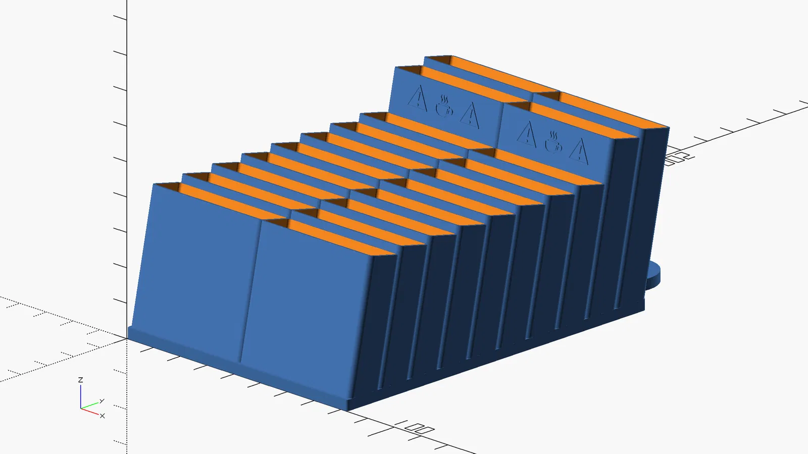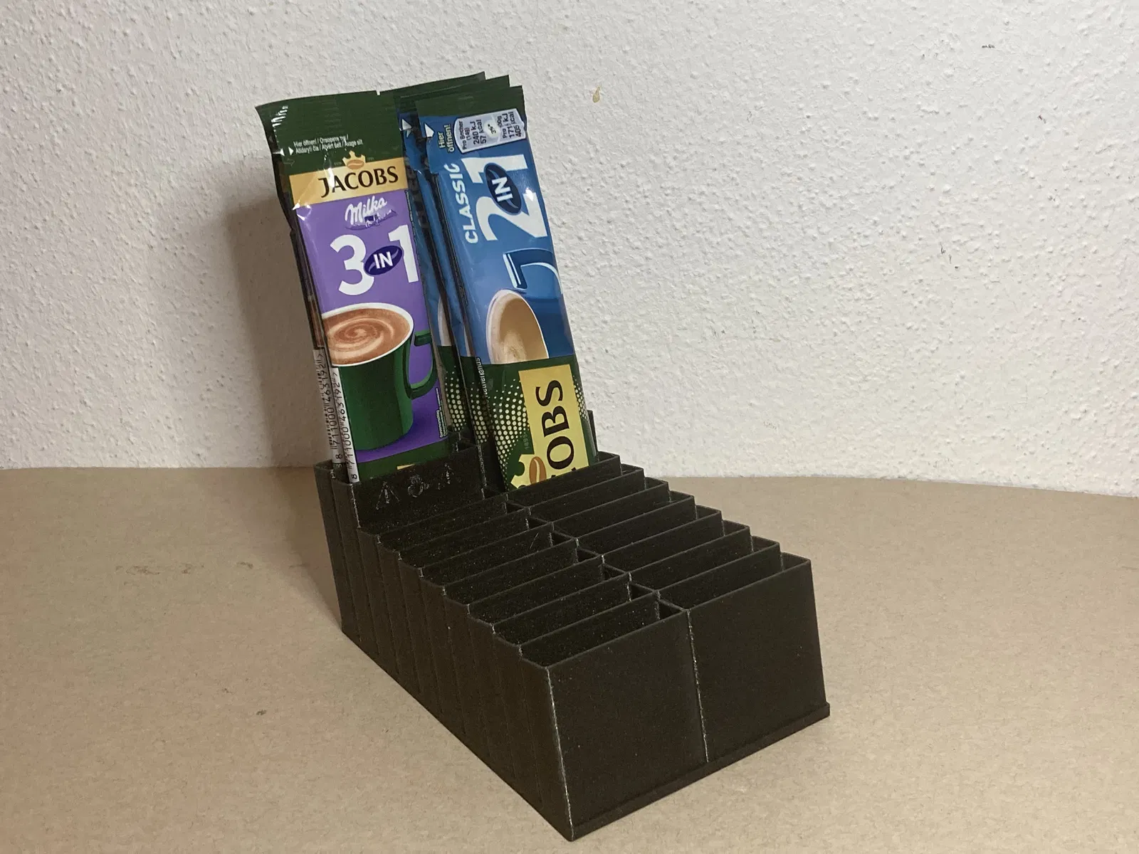 Giá đỡ tiết kiệm không gian để cất giữ que cà phê. Bạn có thể tùy chỉnh giá đỡ cho số lượng các loại que cà phê khác nhau mà bạn muốn lưu trữ. In bằng PLA, STL có sẵn.
