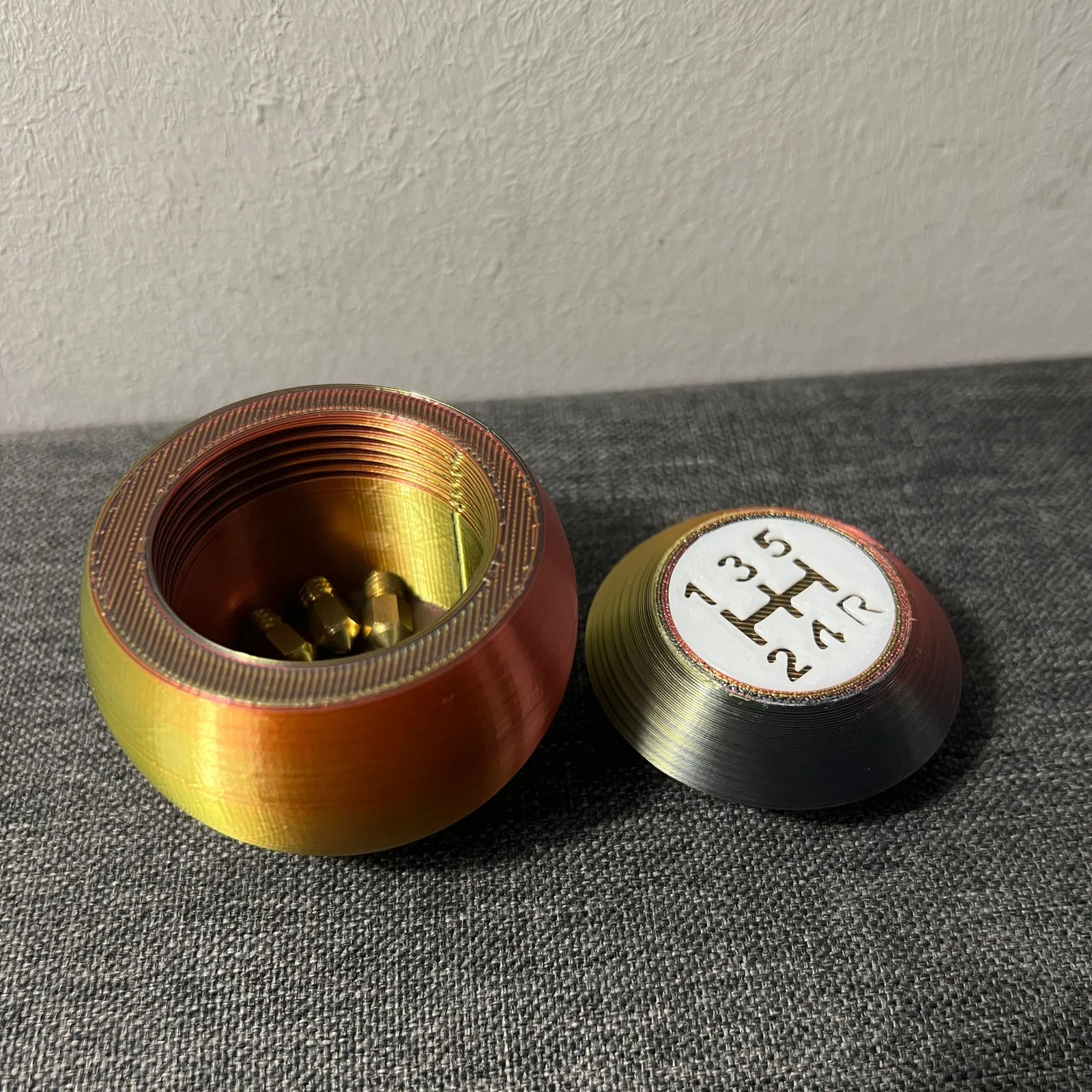 Một chiếc hộp đựng có ren hình núm cần số. Hỗ trợ tối giản và rất dễ in. Hoàn hảo cho những người đam mê xe hơi để lưu trữ đồ đạc nhỏ.