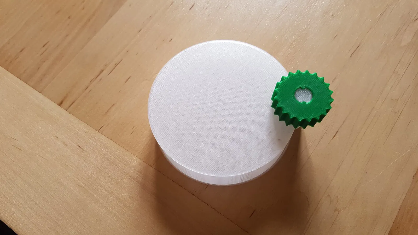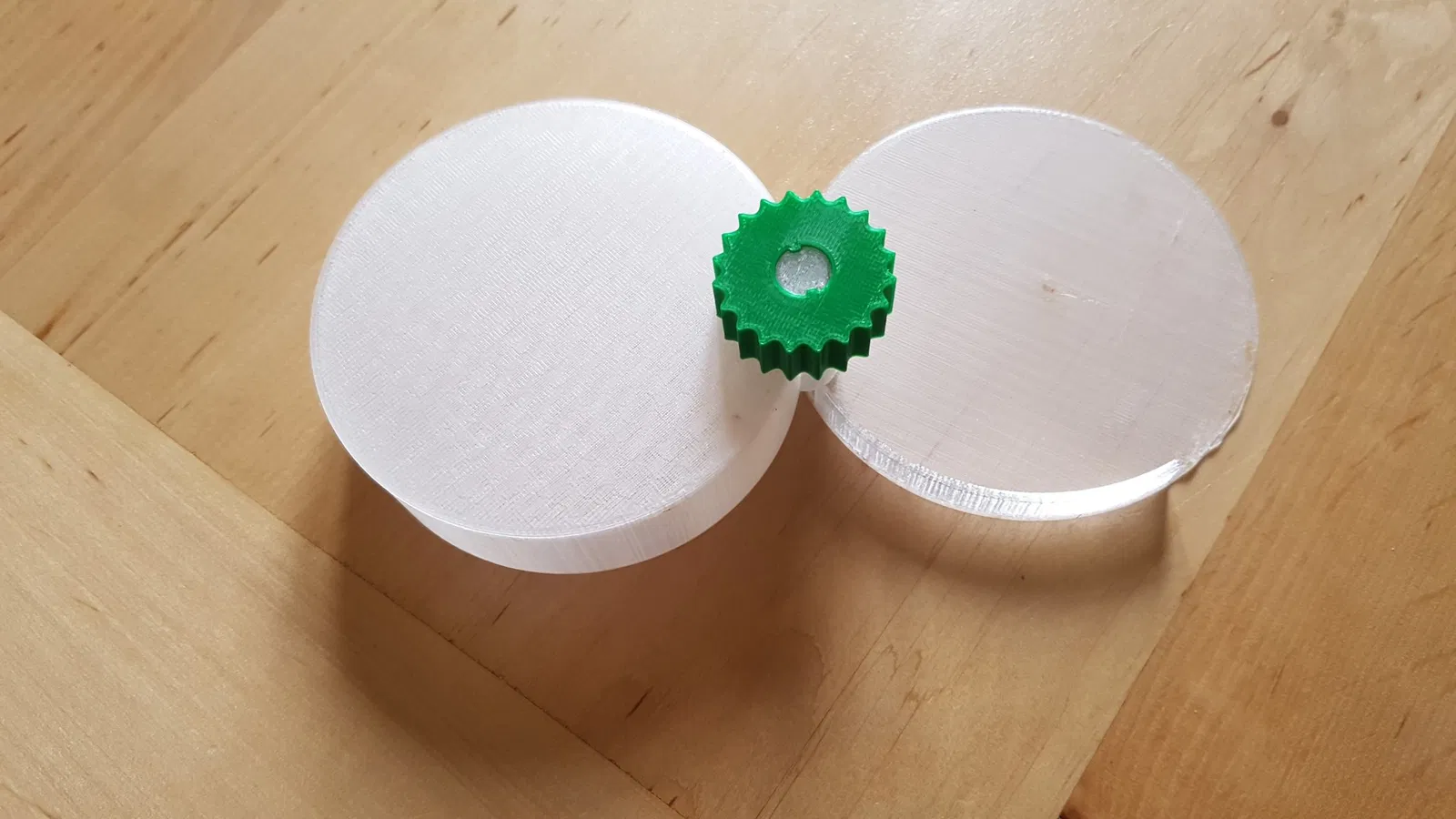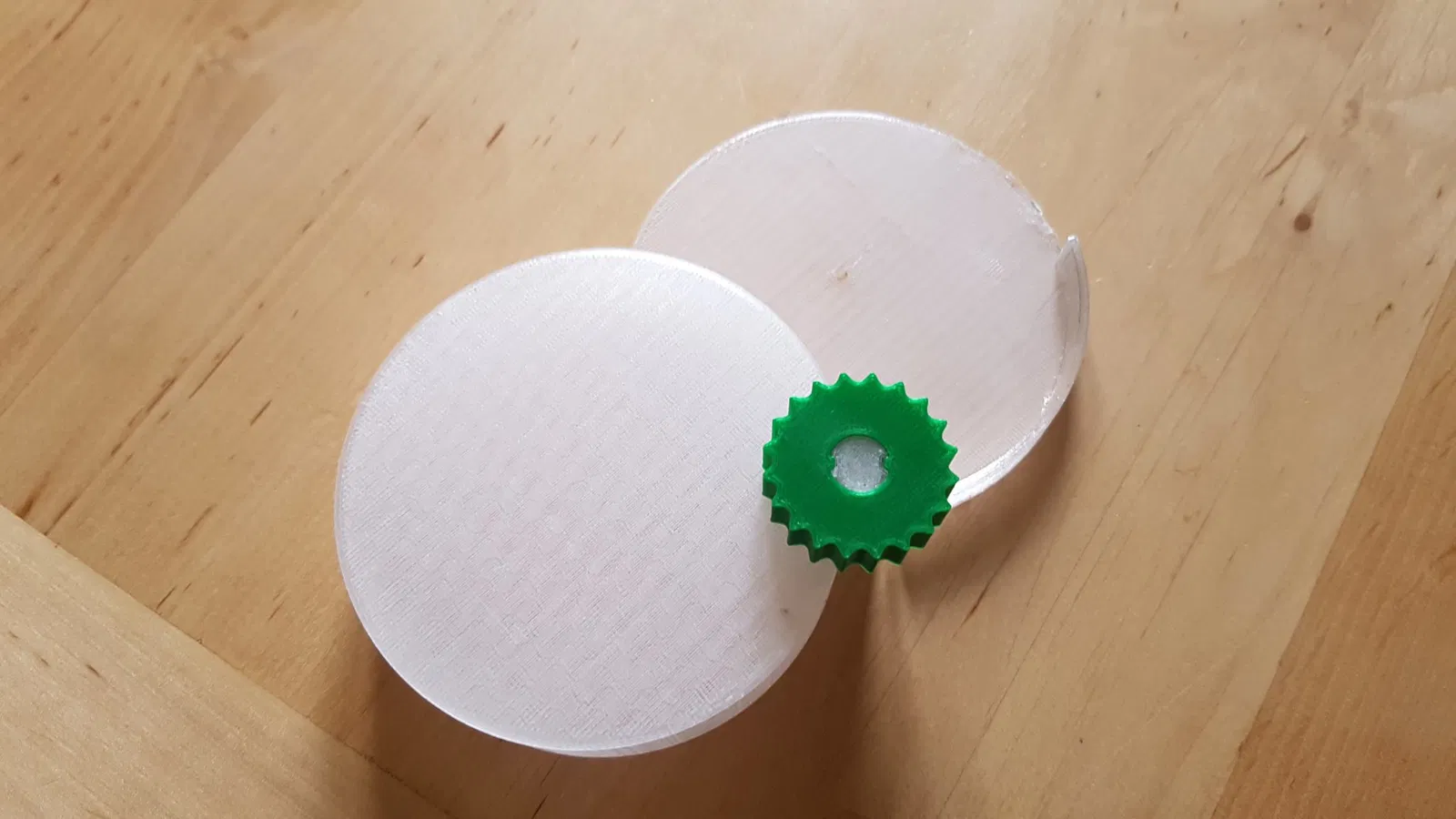 Tôi đã in đáy và phần trên bằng PETG trong suốt, bánh xe quay bằng PLA. Rãnh trên trục rất hẹp, nhưng với một chút áp lực bạn có thể ấn bánh xe vào. Nó vừa khít. Không cần keo.
