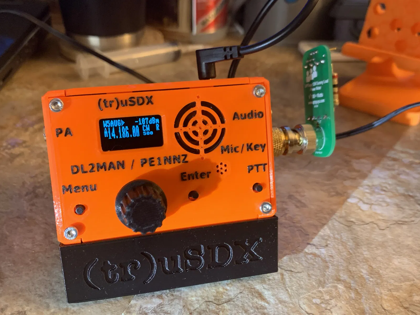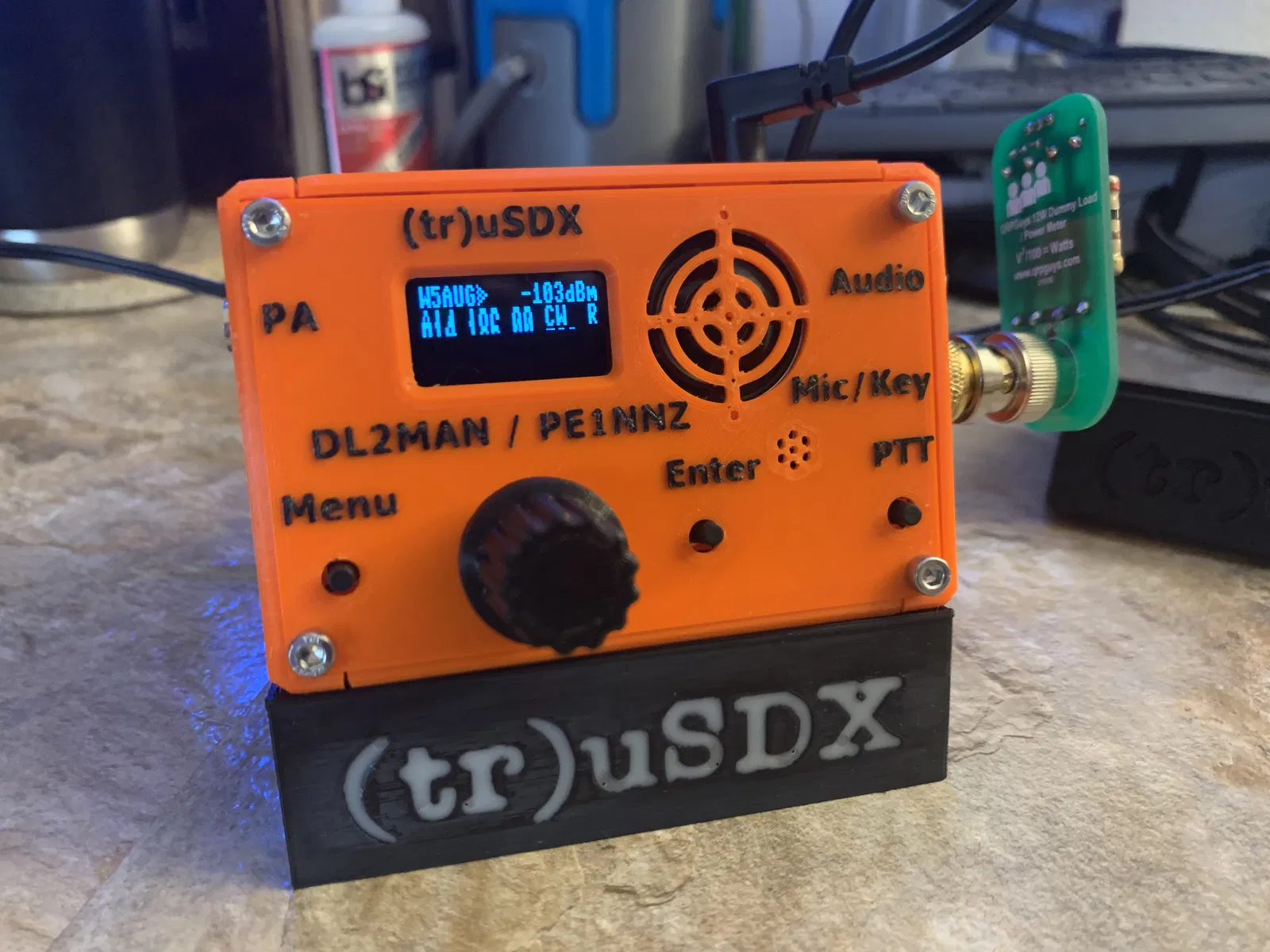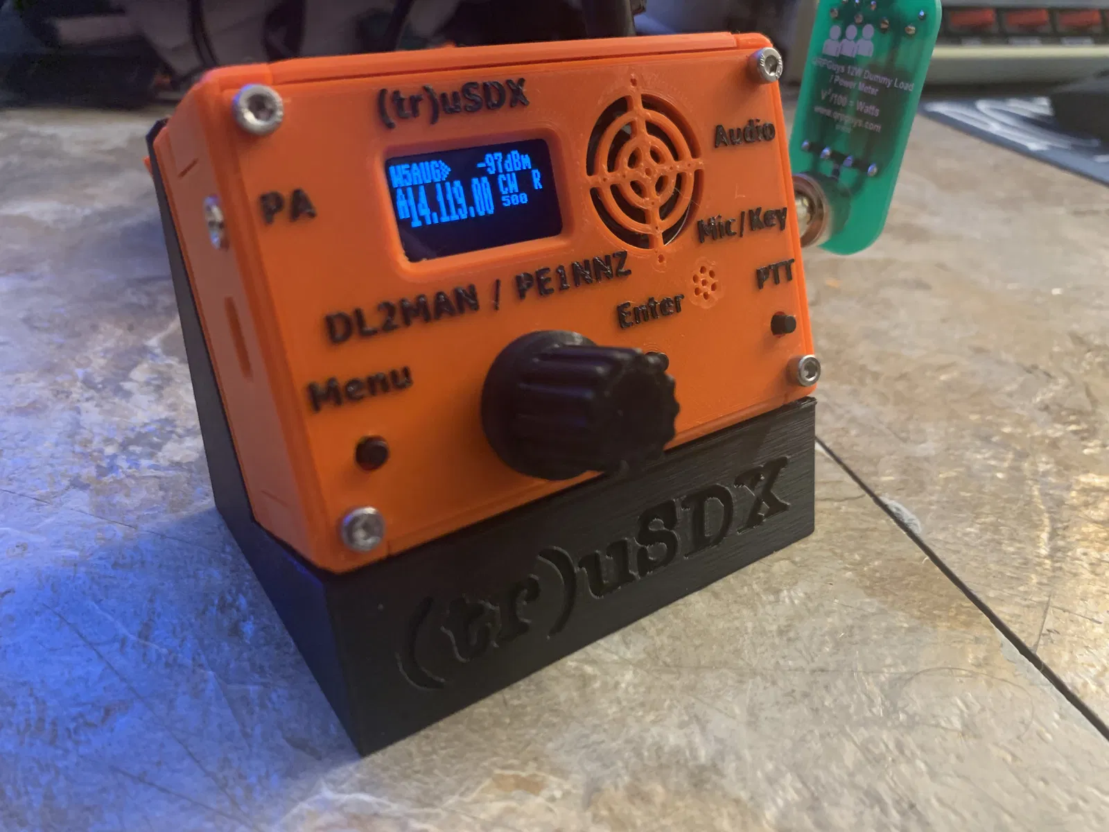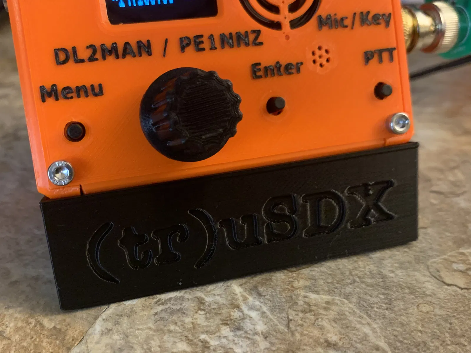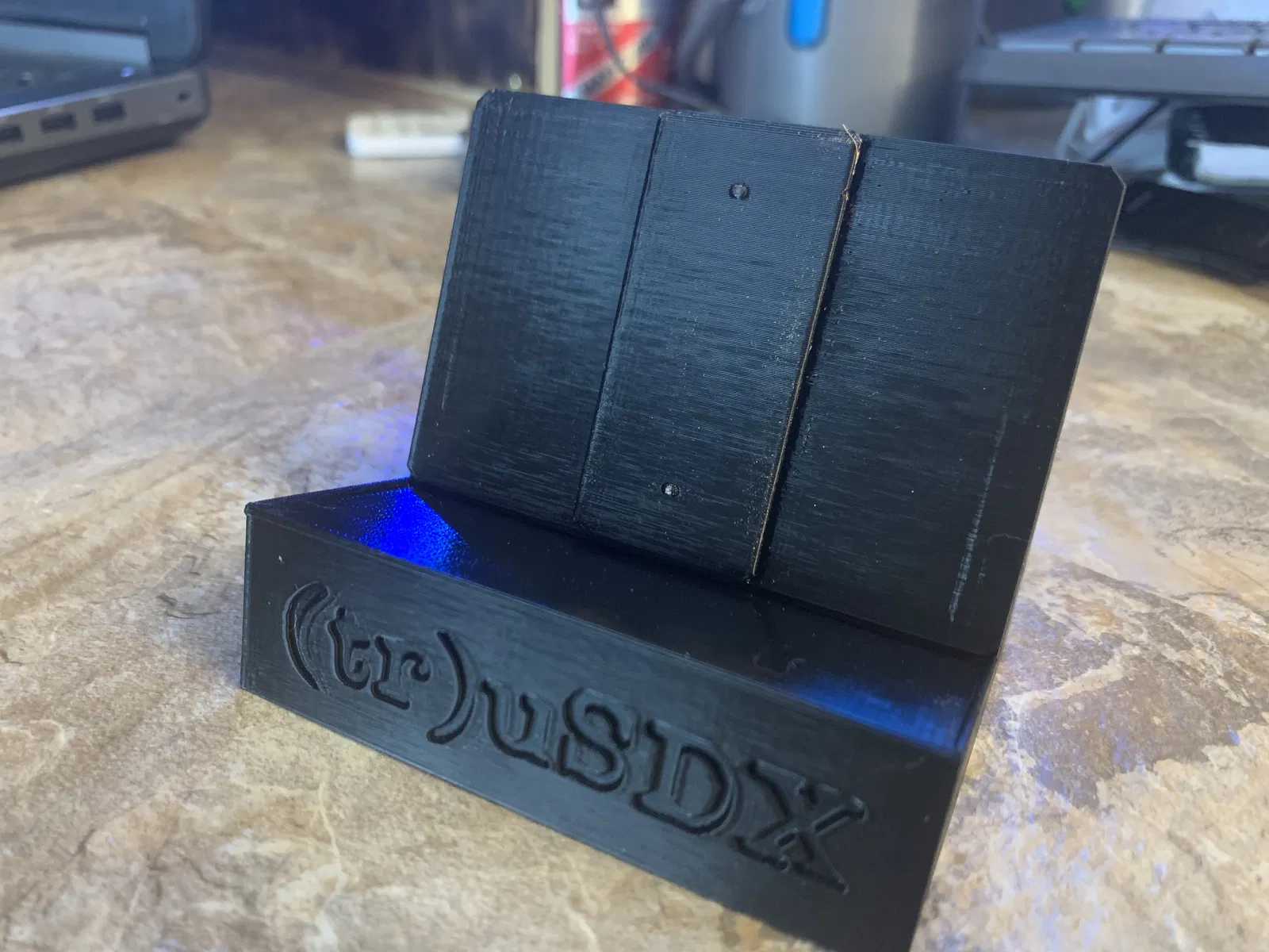 Giá đỡ bàn cho (tr)uSDX của bạn sử dụng đế pin từ DL2MAN. Được thiết kế để sử dụng với hoặc không có hộp pin, giá đỡ này có hình dạng nêm cơ bản với các gờ để giữ chặt bộ thu phát. Một phiên bản cập nhật có ngàm đuôi én để gắn an toàn hơn.