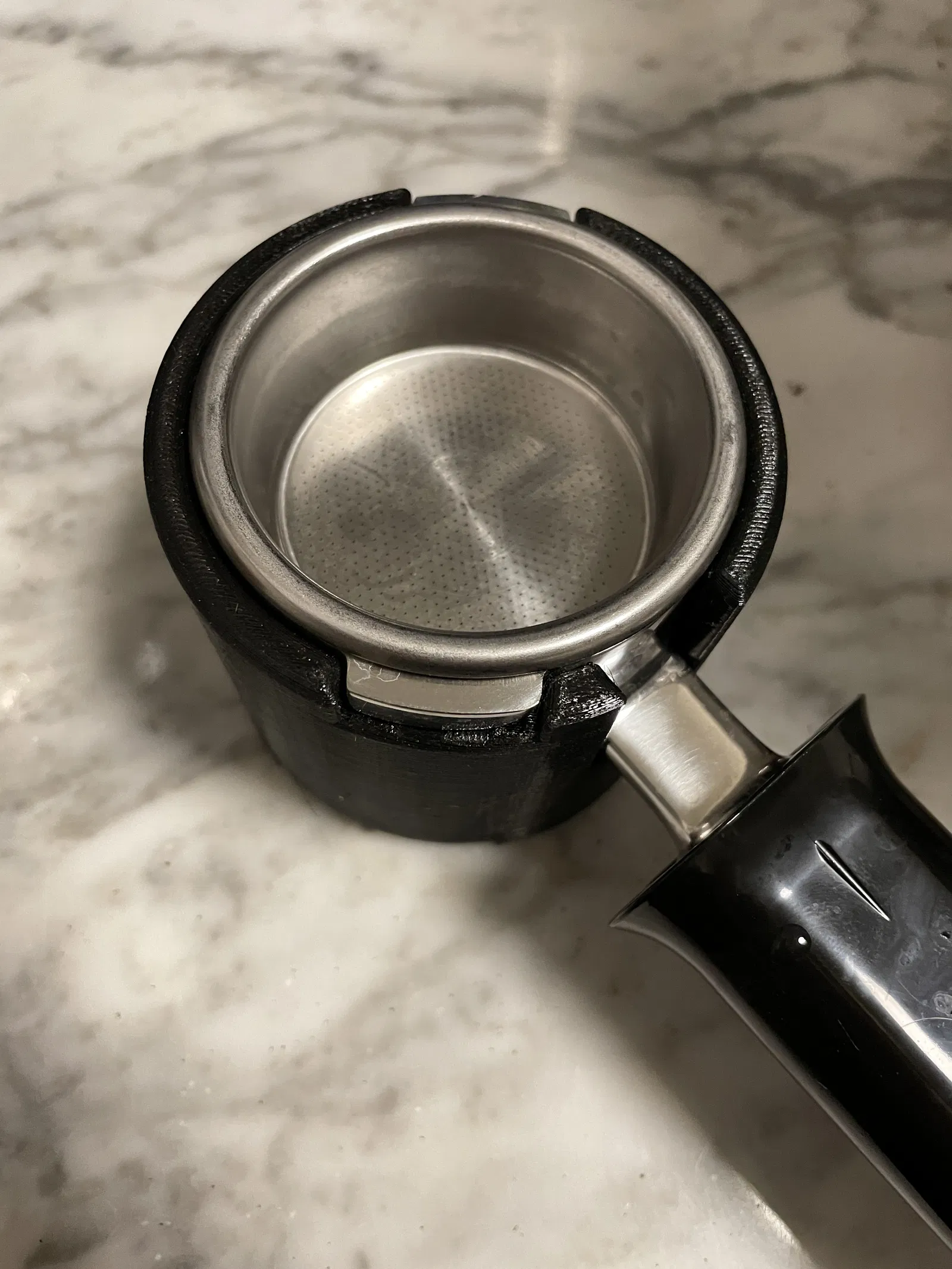 Nó giữ portafilter nằm phẳng và không bị lật. Nó có một lỗ nhỏ để nhỏ giọt ở giữa.