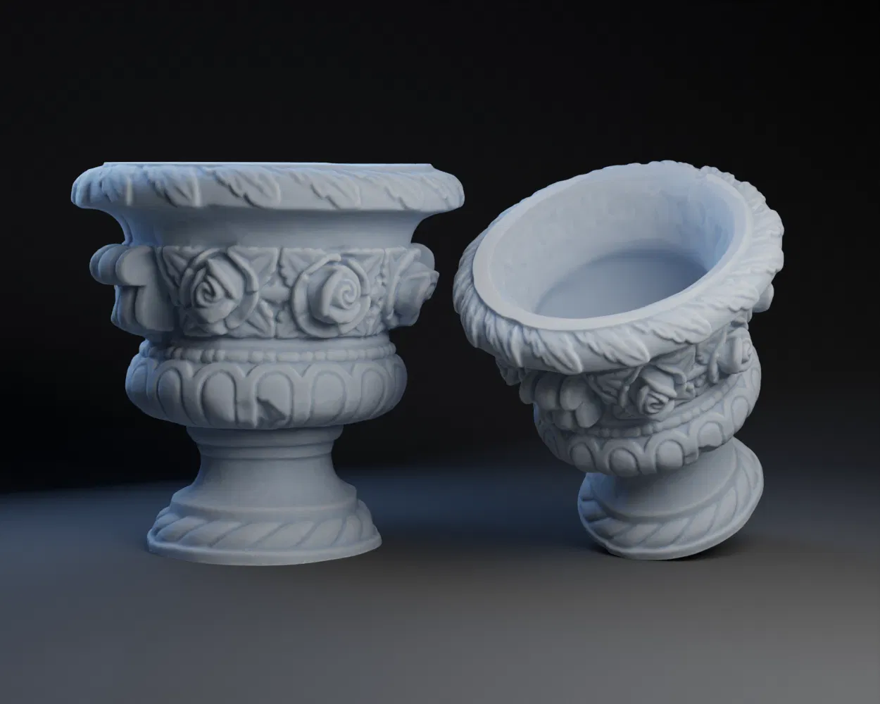 Chậu hoa hồng bê tông bị sứt mẻ, đã được xử lý để dễ sử dụng hơn. Mô hình có đáy và đỉnh phẳng, phù hợp để in 3D theo nhiều hướng khác nhau, đảm bảo độ bám dính tốt.