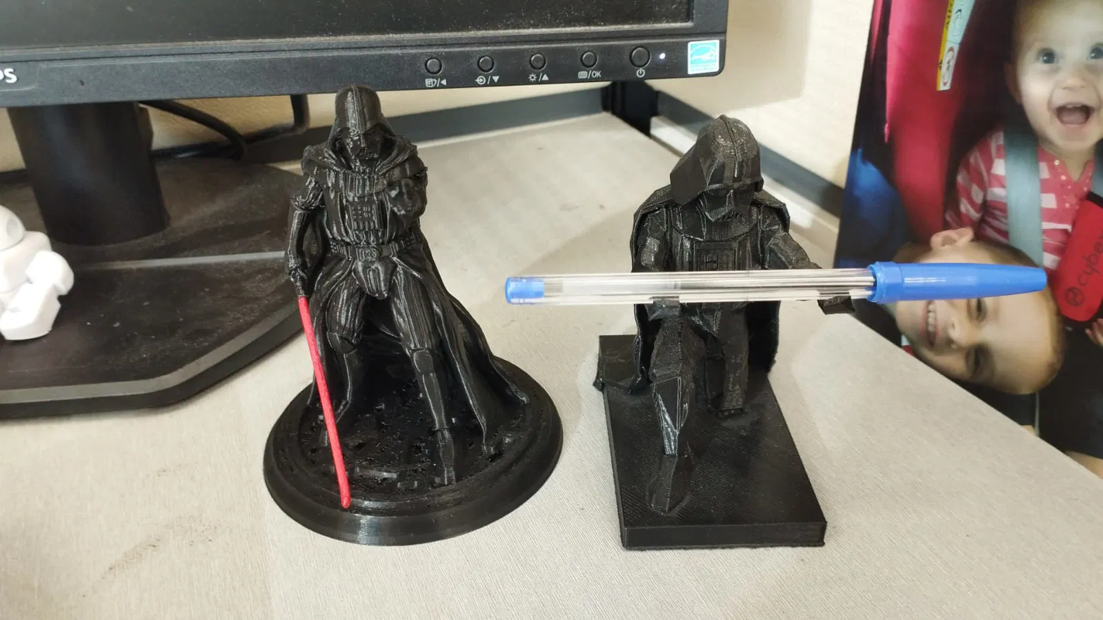 Thu nhỏ mô hình gốc xuống 40% để khớp với kích thước của Darth Vader khác của tôi. Không thể làm cho thanh kiếm đúng ý và thực sự muốn nó có màu khác, vì vậy tôi đã tách thanh kiếm ra, khoan một lỗ 2 mm, sâu khoảng 4 mm, và cắm thanh kiếm màu đỏ vào.