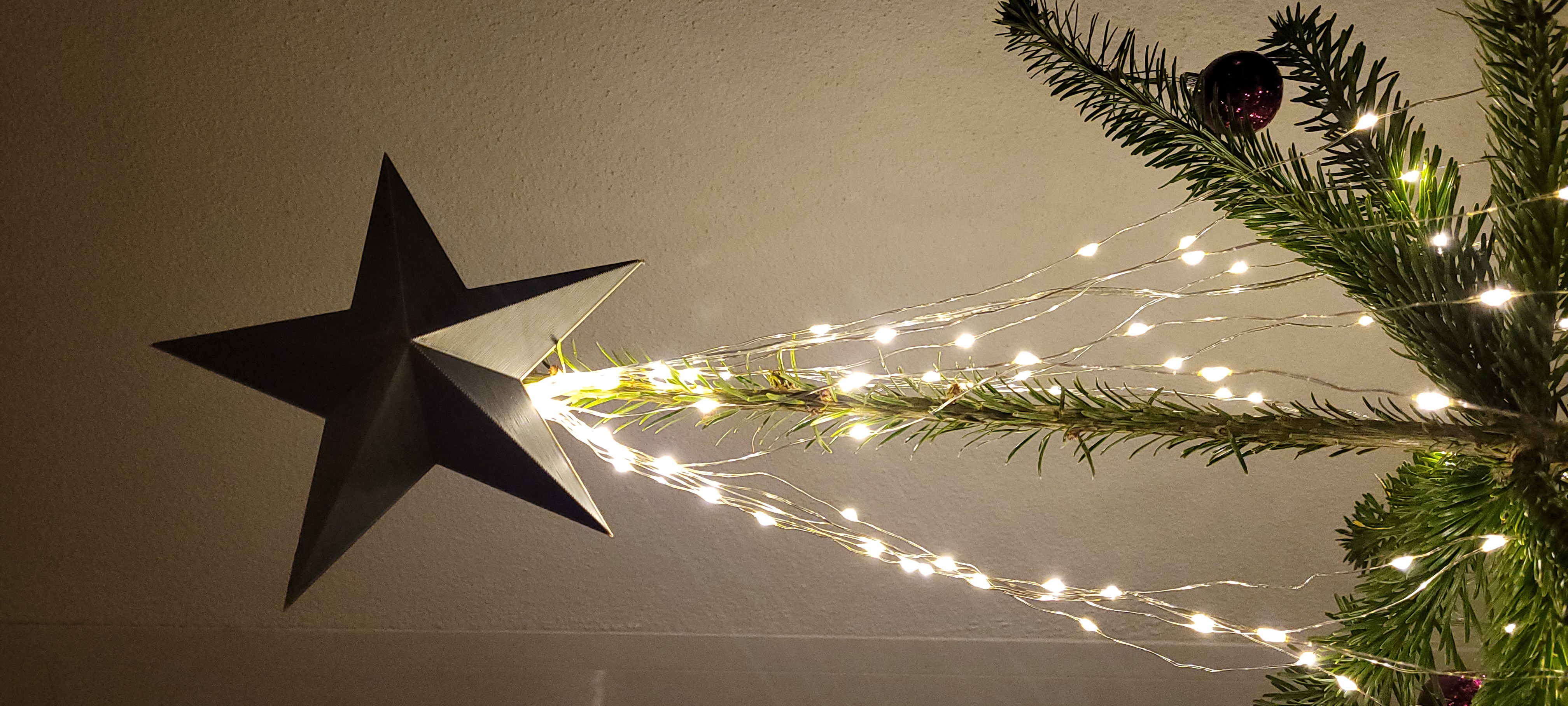 In 3D, the star is printed in two halves, which are then glued together. A zip tie is used to secure the star to the top of your Christmas tree.