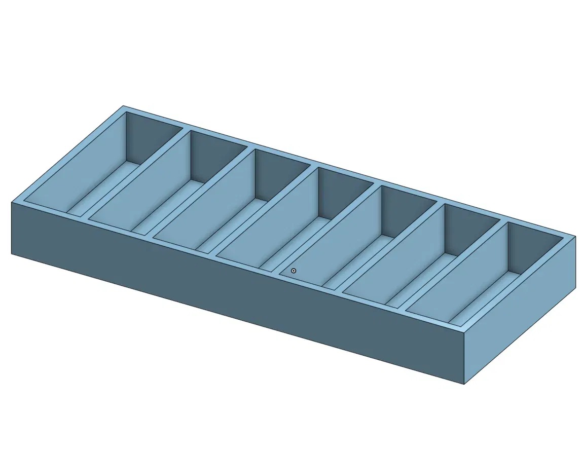 Đây là một giá đỡ/tổ chức băng cho Commodore 64. Có một giá đỡ băng khác ở đó, nhưng tôi nhận thấy rằng băng Epyx Fast Load sẽ không vừa với nó, vì vậy tôi đã làm giá đỡ băng này bằng OnShape. Hai khe ở phía sau sâu hơn một chút (2.2 cm) so với năm khe phía trước (2.15 cm) để giá đỡ băng có thể chứa một số băng dày hơn một chút. Tôi đã đăng một bức ảnh về các kích thước nếu ai đó muốn tự làm điều này hoặc muốn dễ dàng sửa đổi thiết kế.