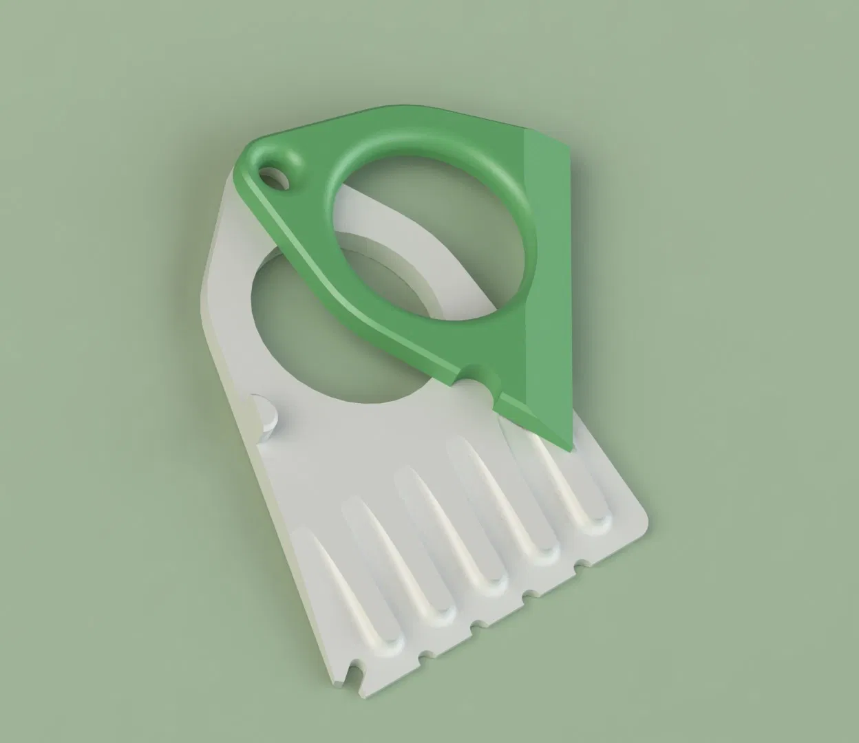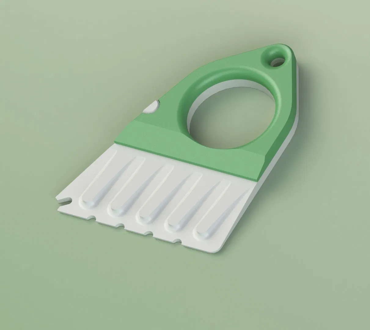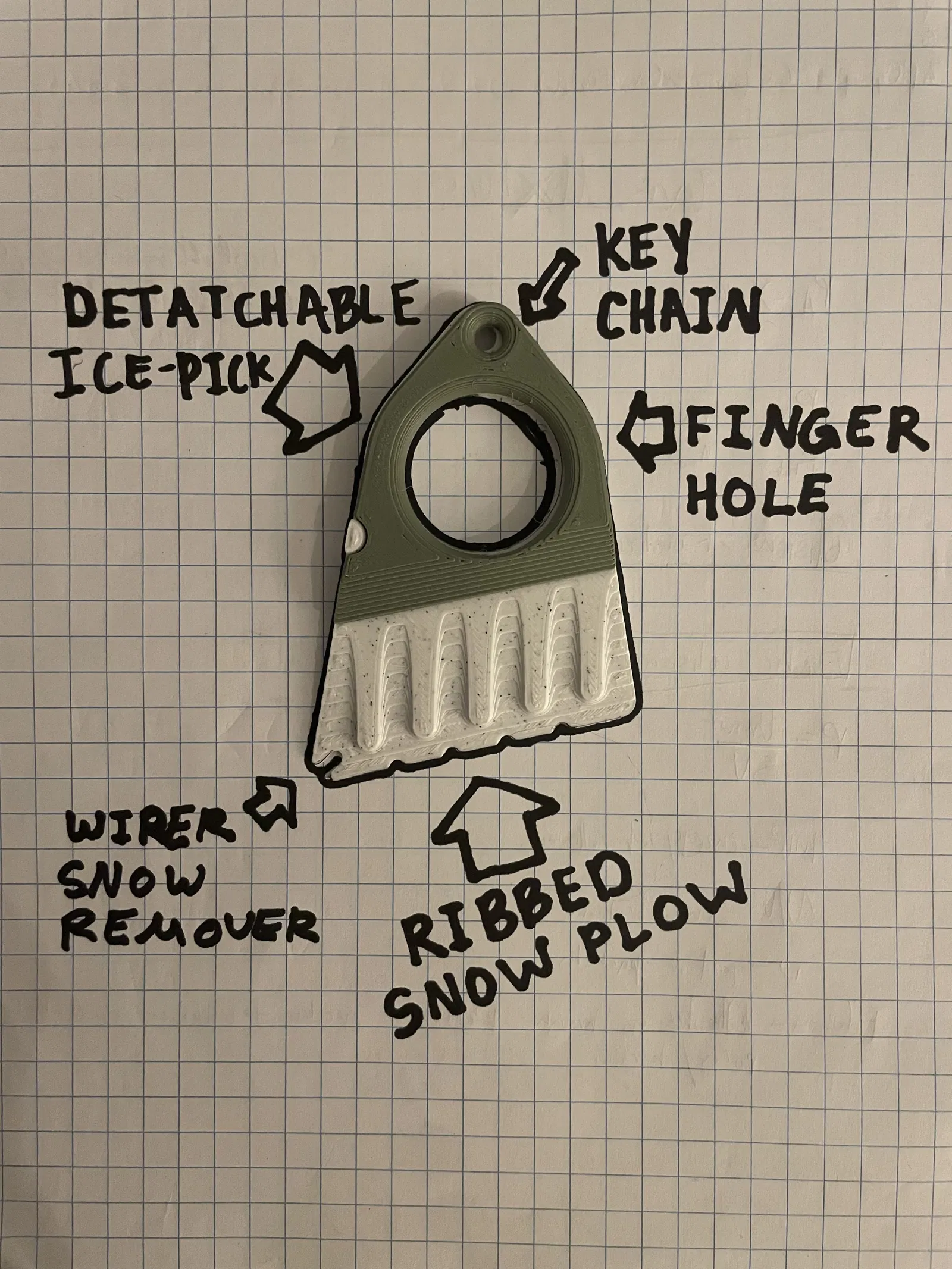 Một thiết kế đơn giản và thanh lịch, kết hợp dụng cụ cạo tuyết và dụng cụ gạt băng trên một thiết bị duy nhất, dễ sử dụng. Dụng cụ cạo băng và tuyết này có thiết kế 2 phần đơn giản có thể giữ lại với nhau bằng một móc chìa khóa rẻ tiền, giúp loại bỏ nhanh chóng tuyết và băng khỏi kính chắn gió và cửa sổ.