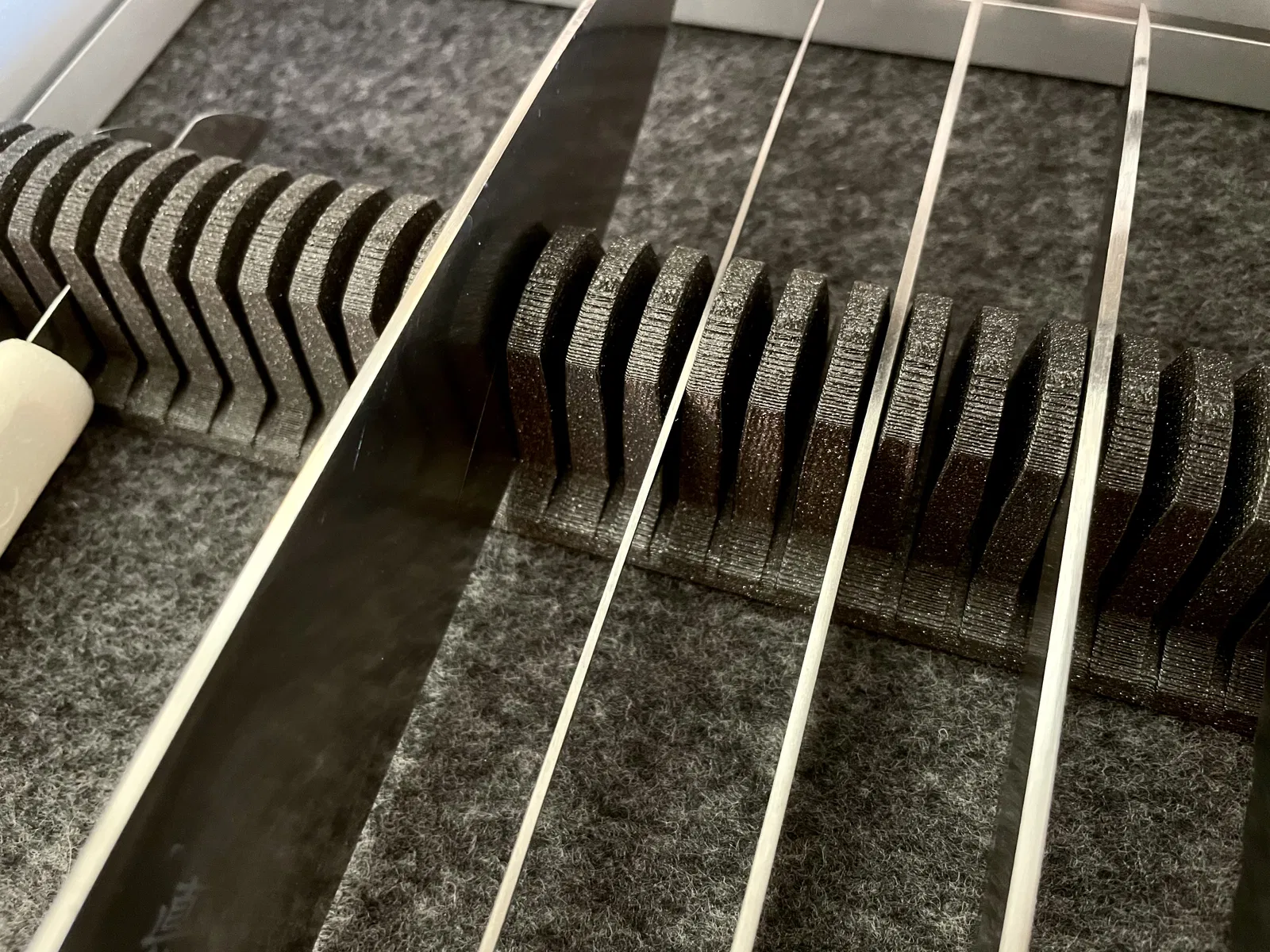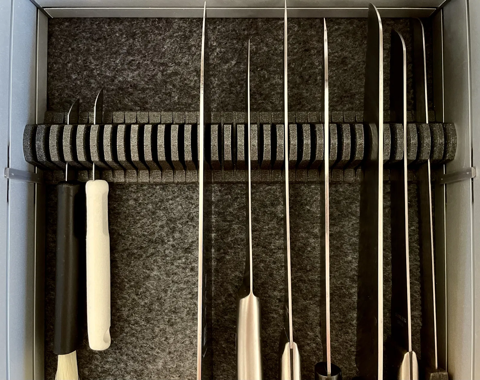 Khối dao nhà bếp cho ngăn kéo, hoàn toàn vừa vặn với các bộ chèn nhôm Vedum. Dài 259 mm, khoảng cách giữa các khe dao là 8 mm. Bản in trong hình có độ dày lớp là 0,2 mm.