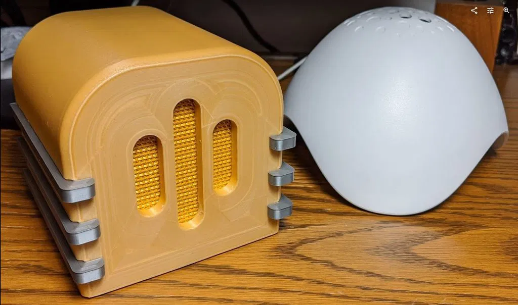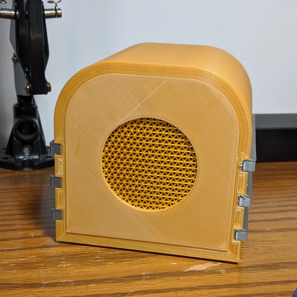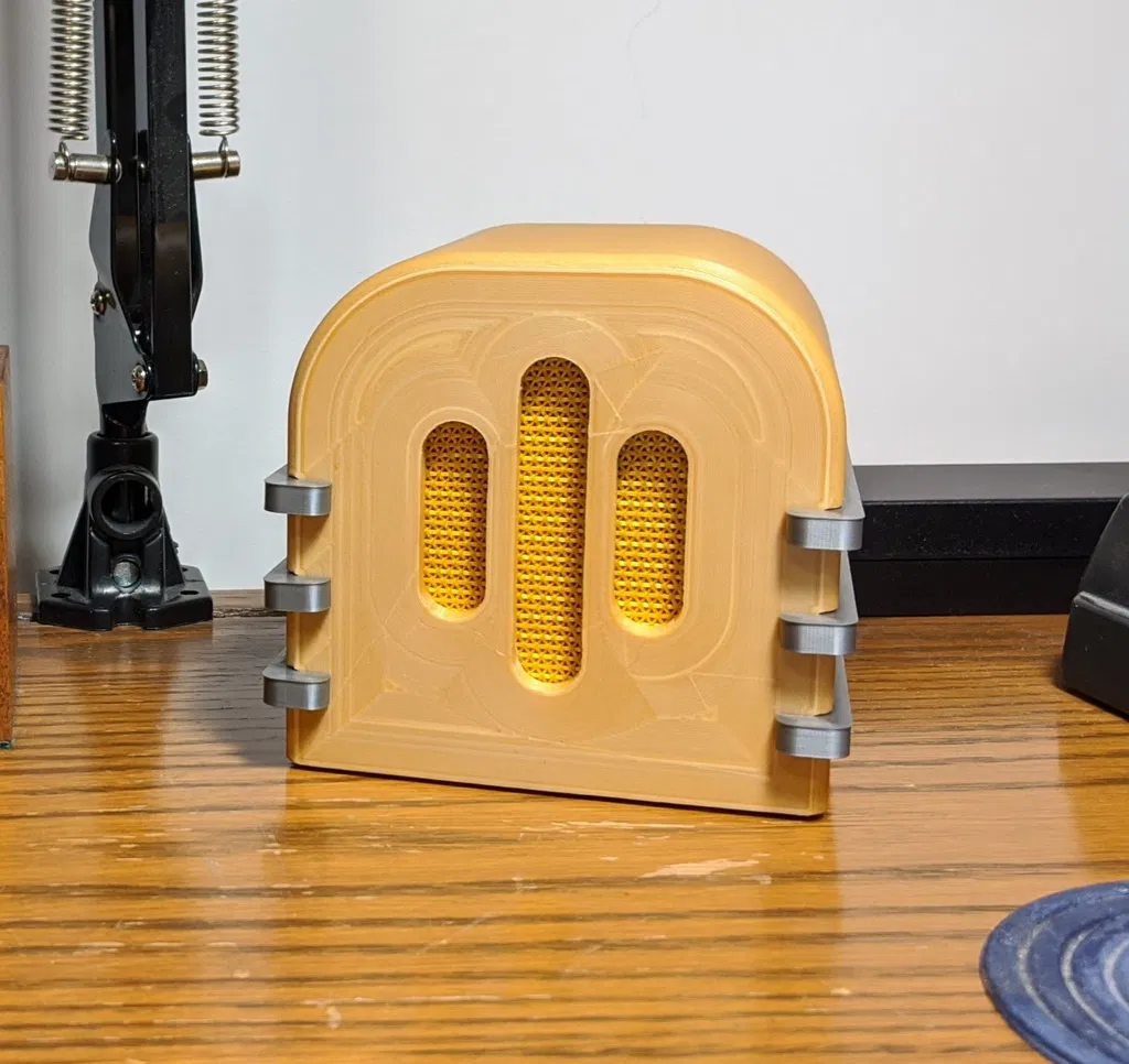 Đây là lần đầu tiên tôi cố gắng làm một thứ gì đó thực tế nhưng có một chút khía cạnh nghệ thuật. Tôi có chiếc loa Bluetooth swag này từ một hội nghị mà tôi không thích. Nó hoạt động tốt, nhưng nó có đèn nhấp nháy và có hình dạng giống cái pod ngớ ngẩn. Tôi muốn lấy các bộ phận điện tử ra khỏi nó và tạo một lớp vỏ "tinh tế" hơn cho nó. Thời kỳ của radio kiểu art deco là nguồn cảm hứng cho thiết kế. Đây là kết quả. Tuyên bố miễn trừ trách nhiệm: Tôi không phải là nhà thiết kế, nghệ sĩ chuyên nghiệp hay bất cứ thứ gì tương tự. Kỹ năng CAD của tôi là tự học và tôi có rất nhiều ý tưởng và nguồn cảm hứng (ai mà không có?). Tôi nghĩ tôi sẽ chia sẻ kết quả với cộng đồng phòng trường hợp ai đó thích nó và muốn in nó. Ý kiến đóng góp mang tính xây dựng đều được hoan nghênh!