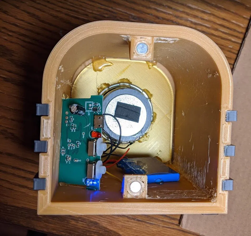 Bạn sẽ nhận thấy các giá đỡ nam châm trên thân loa không nằm trên cùng một mặt phẳng. Đây là một sai lầm. Tôi đã khắc phục nó trên nắp sau vì tôi đã in thân loa (12 giờ) và không muốn làm lại.