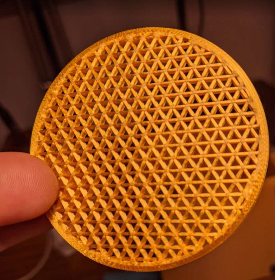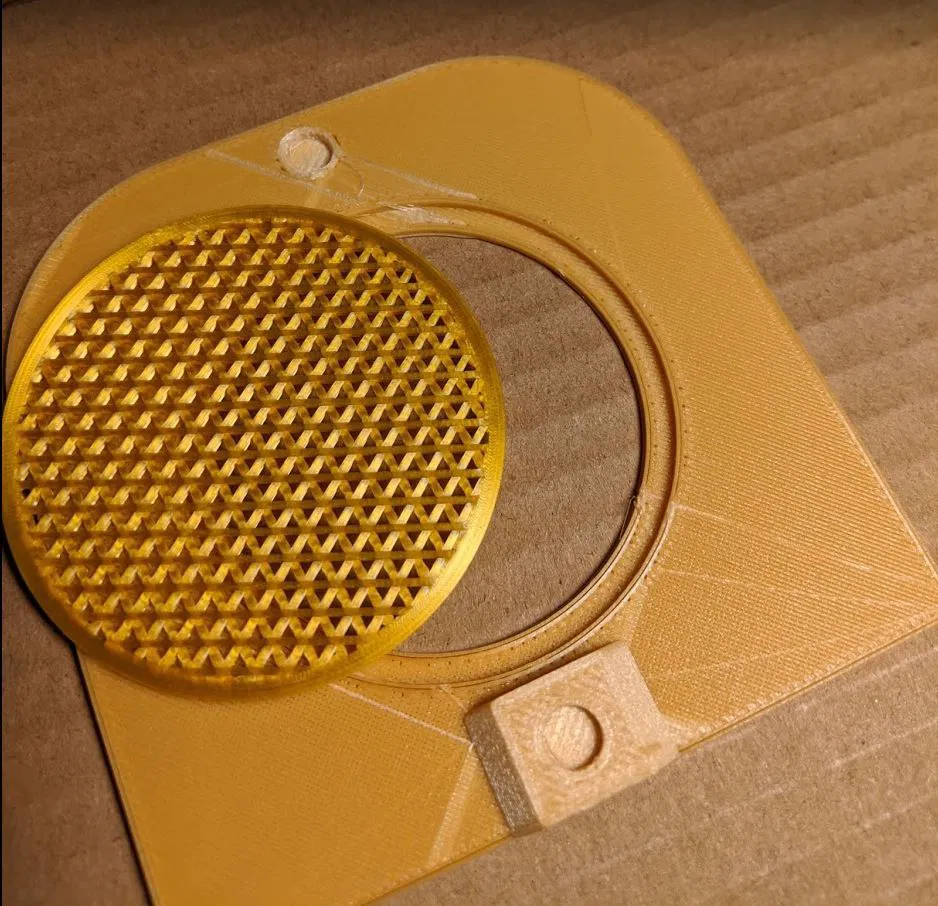 Đối với "FrontMesh" và "BackCoverGrill", tôi chỉ cần cài đặt trong phần mềm cắt lớp của mình là không có lớp trên hoặc dưới, 2 lớp chu vi và ruột tam giác. Tôi đã sử dụng 75% cho "FrontMesh" và 50% cho "BackCoverGrill". Tôi đã sử dụng sợi PLA vàng lấp lánh cho các bộ phận này.