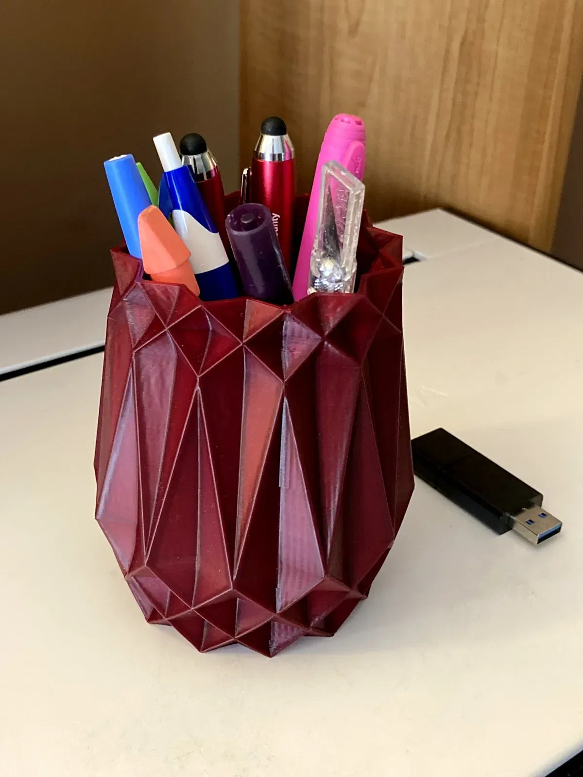 Một lọ bút/chì với các rãnh hình kim cương chéo nhau để giữ những chiếc bút và chì yêu thích của bạn.