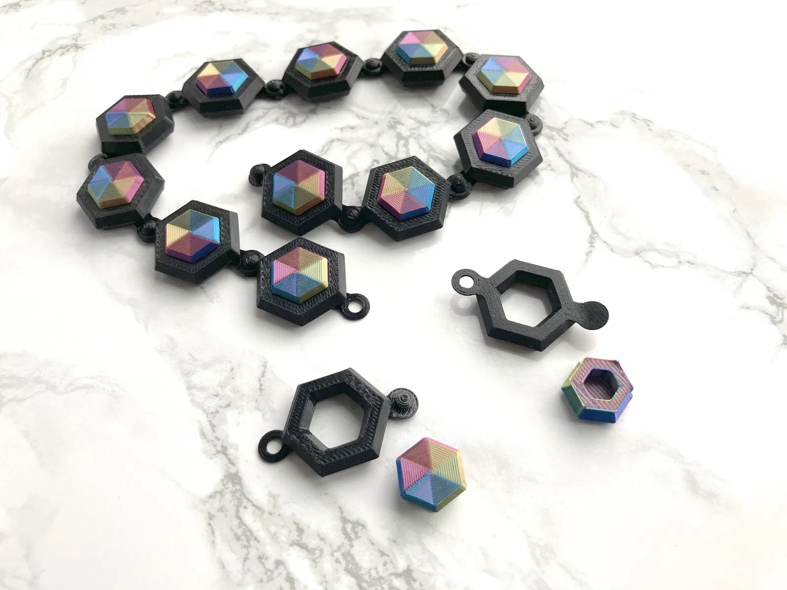 Mọi thứ đều in rất dễ dàng. Các mắt xích in mặt lên trên trong khi đá quý in mặt xuống dưới. Các viên đá quý có lỗ ở giữa chủ yếu để tiết kiệm sợi vì chúng không cần phải đặc.