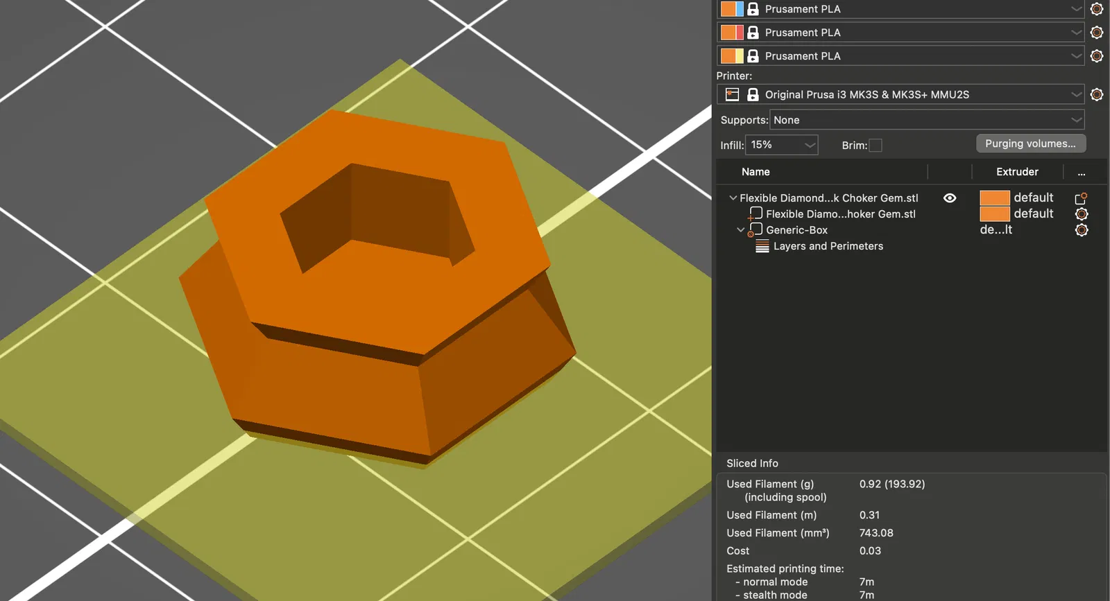 Nếu bạn định sử dụng sợi đa màu cho đá quý, tôi khuyên bạn nên tăng số lượng đường viền cho toàn bộ hoặc thêm một hộp sửa đổi và đảm bảo lớp nền có 15 đường viền (hoặc bất cứ điều gì bạn cần) để nó in theo một hướng liên tục để có được màu sắc phù hợp. Nó cũng trông đẹp hơn trên một tấm đế mịn so với tấm có họa tiết.