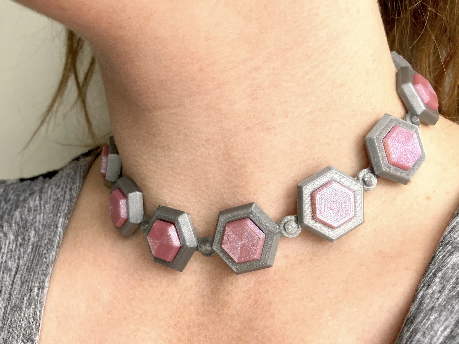 Chiếc vòng cổ/choker này bao gồm các mắt xích TPU có một đầu tròn/phình và một đầu là vòng lặp. Chúng dễ dàng kết nối với nhau rất chặt chẽ để chúng không bị tuột ra. Để làm cho chiếc vòng cổ trở nên thú vị, các mắt xích có một lỗ ở giữa vừa vặn với một viên đá quý giống kim cương mà bạn có thể in từ bất kỳ sợi PLA nào bạn chọn.
