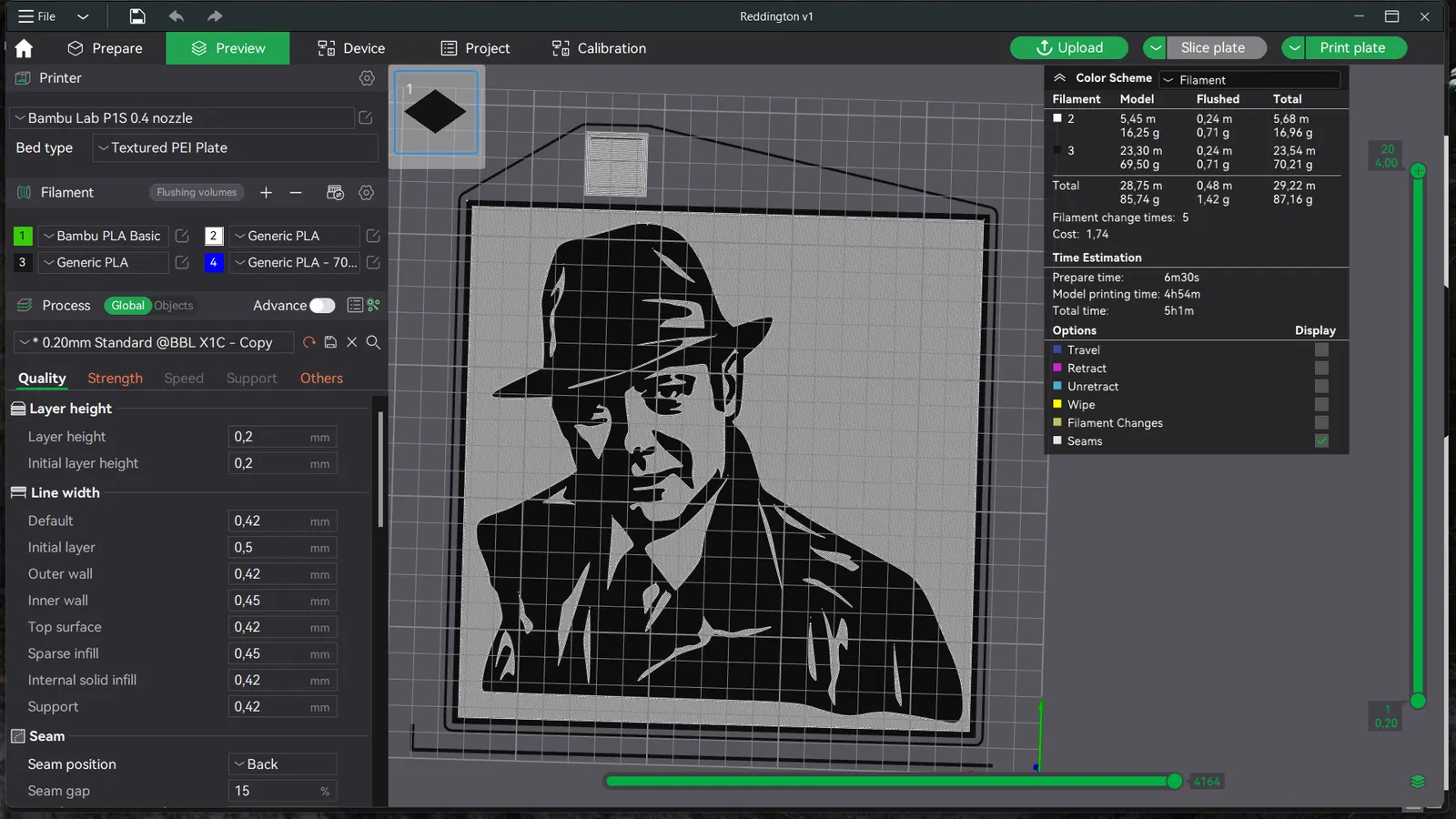 Hình dập nổi của riêng tôi với hình ảnh Raymond Reddington từ Black List, được tạo trong Fusion 360 và in trên máy in Bamboo Lab P1S. Mô hình phi thương mại.