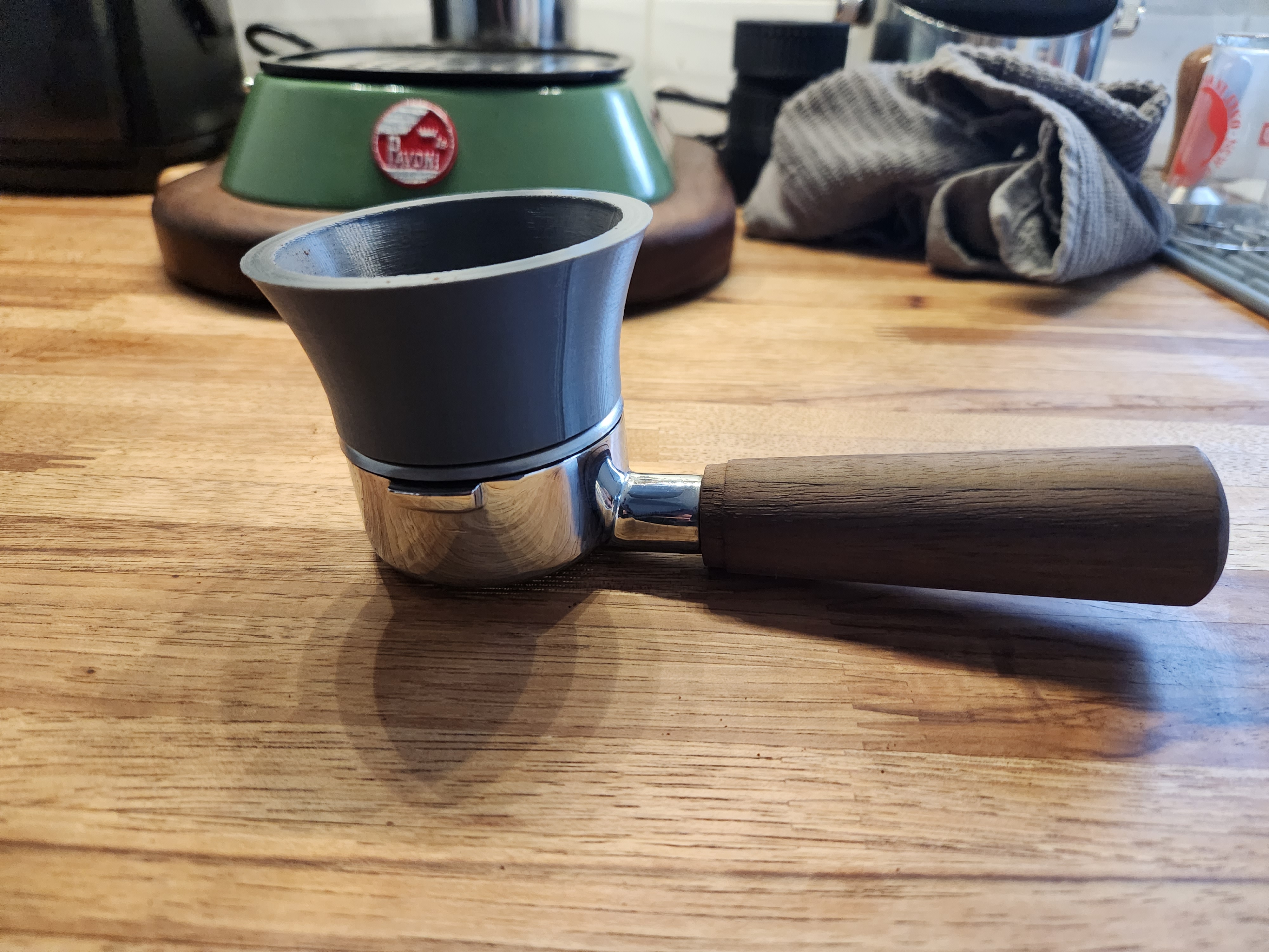 Cụ thể, đây là tay pha cà phê mà mô hình được thiết kế để hoạt động cùng, mặc dù tôi có một tay cầm portafilter bằng gỗ tùy chỉnh có thể có đường kính hơi khác so với tay cầm nguyên bản. Tay cầm của tôi đặt phẳng với mặt bàn khi portafilter được đặt vào giá đỡ này.