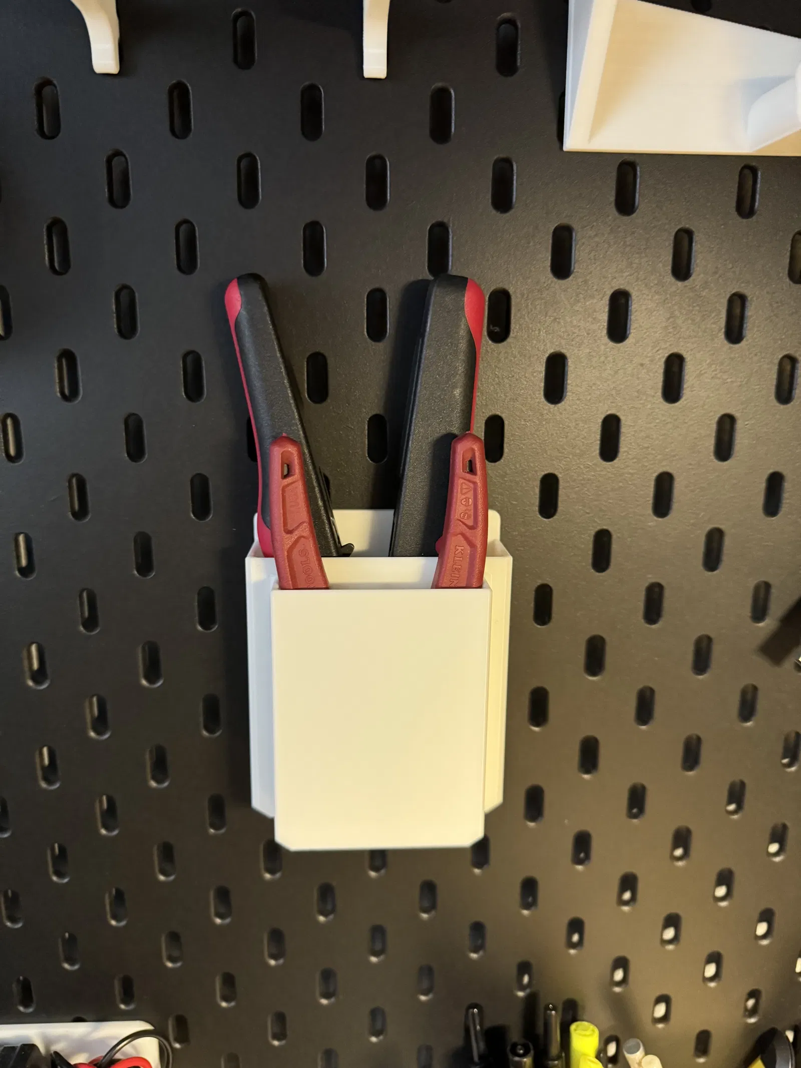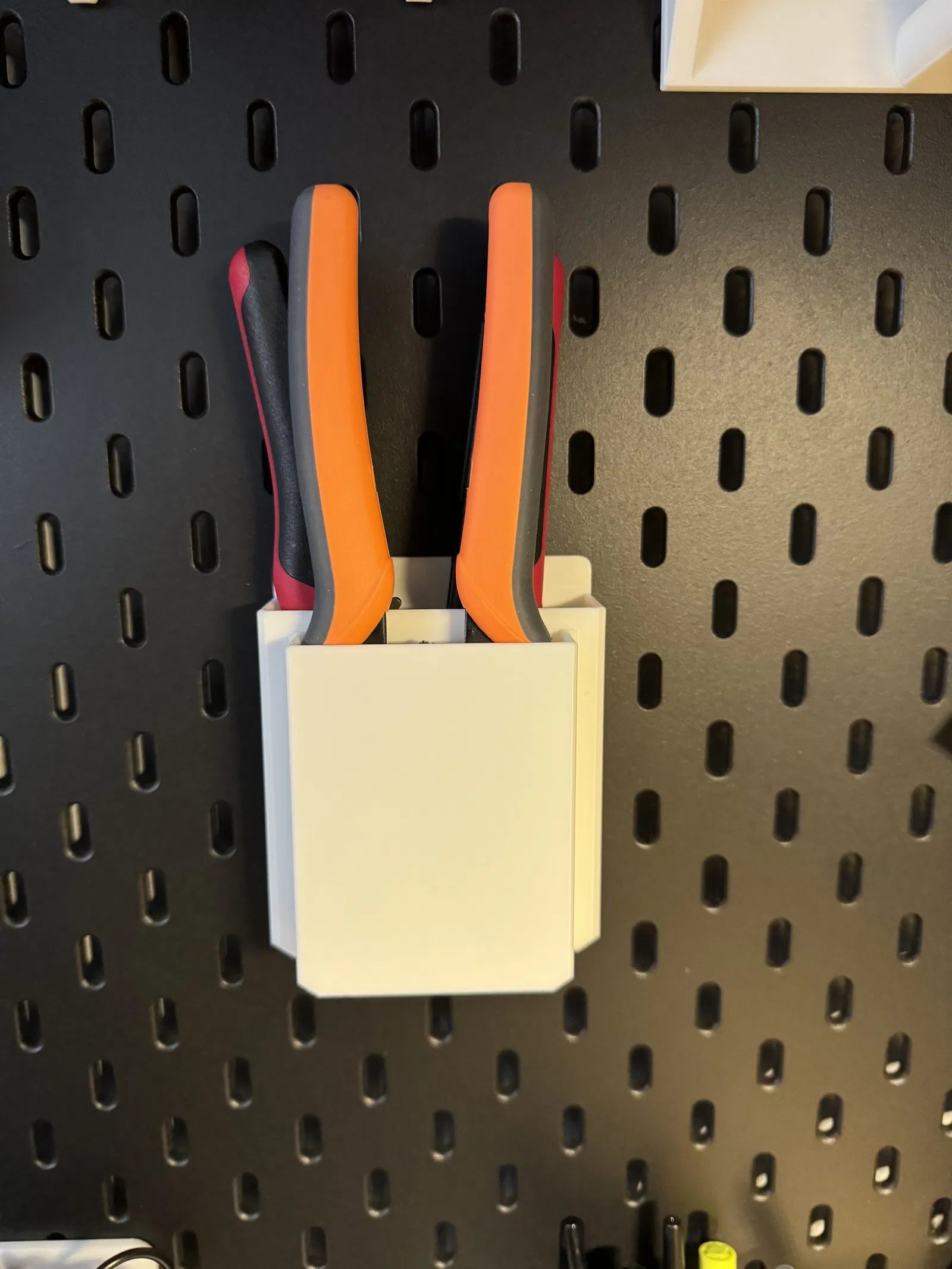 Giá đỡ Skadis cho kìm bấm đầu cos, kết hợp với kìm bấm JST hoặc kìm cắt. Thiết kế để in thẳng đứng, cần vật liệu hỗ trợ cho phần chốt gắn phía sau, giúp tổ chức dụng cụ trên bảng Skadis một cách gọn gàng.