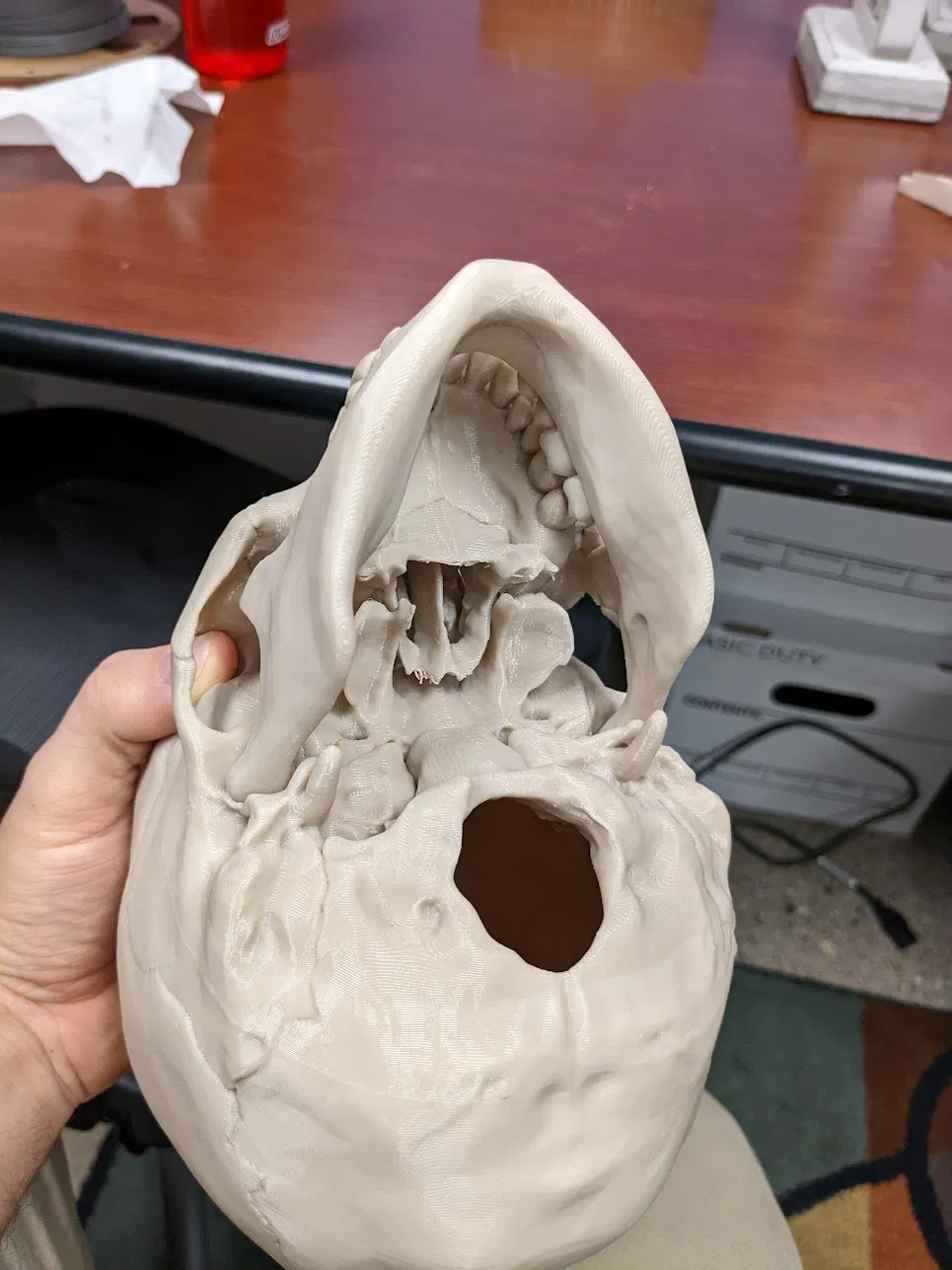 Hộp sọ người được cắt thành hai bản in lớn, dễ dàng lắp ráp. Bản in này được thiết kế tối ưu cho việc in ấn, giảm thiểu nhu cầu về vật liệu hỗ trợ và mang lại kết quả chi tiết.