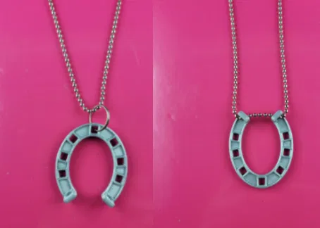 Có thể trưng bày hoặc treo lên dây chuyền theo hai cách khác nhau. Mặt dây chuyền móng ngựa này có thể được in bằng PLA với độ đầy 20% và chiều cao lớp 0,3mm mà không cần hỗ trợ hoặc viền.