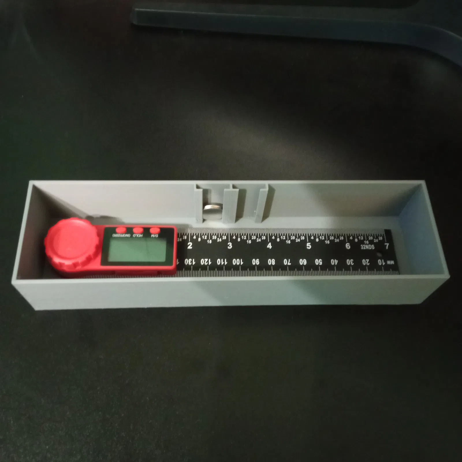 Hộp đựng thợ đo góc 200mm, kèm ngăn đựng pin CR 2032. Bản in 3D này được thiết kế để giữ thợ đo góc của bạn an toàn và ngăn nắp. Khuyến nghị in bằng PLA với độ dày lớp 0.2mm.