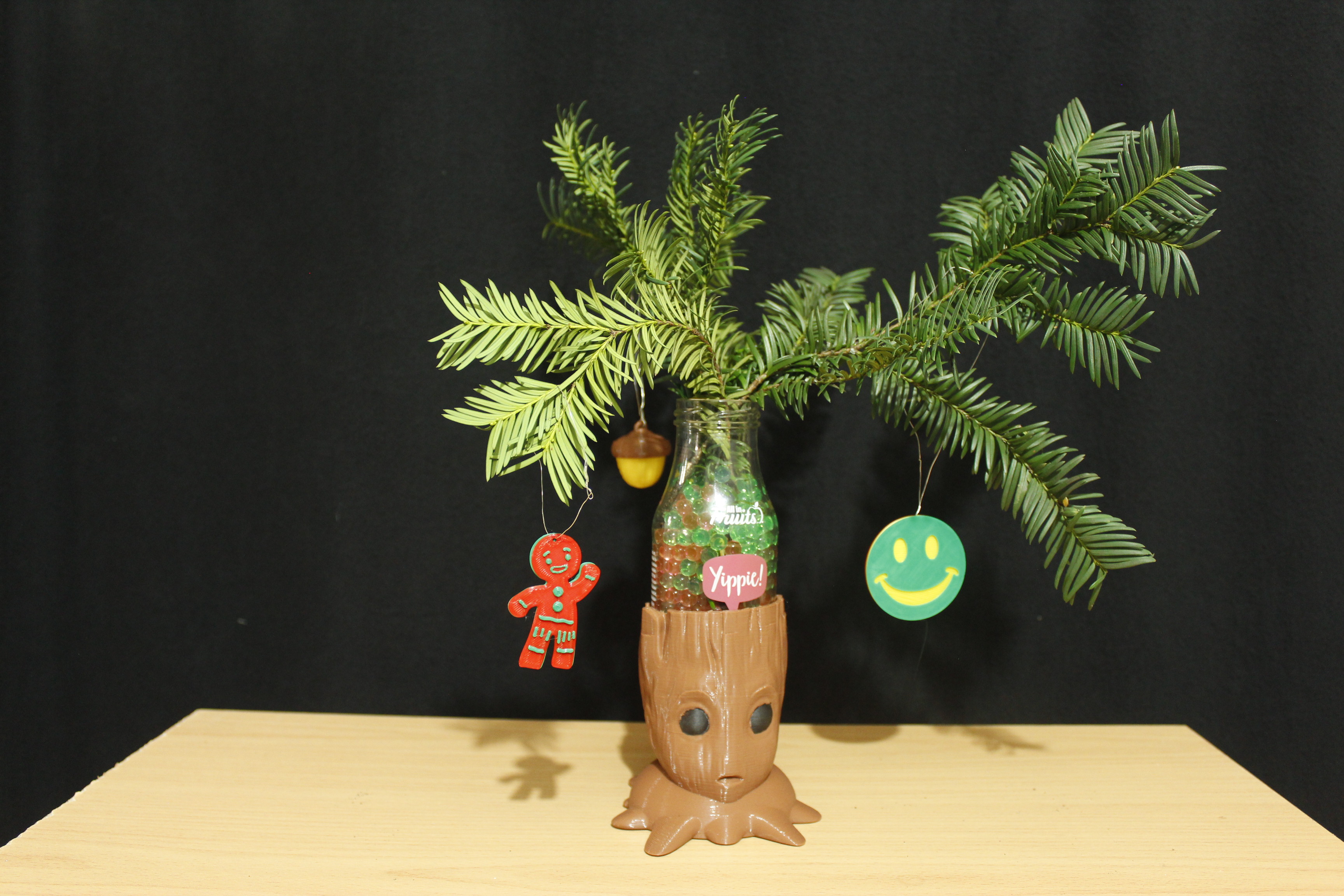 Bản remix Groot Con cho Giáng Sinh này được thiết kế để có sự ổn định, với phần đầu được khoét rỗng vừa ly sinh tố. Người tạo đã trang trí mắt bằng sơn và sử dụng nó như một món quà Giáng sinh độc đáo, được gửi đi an toàn sau khi in bằng PLA.