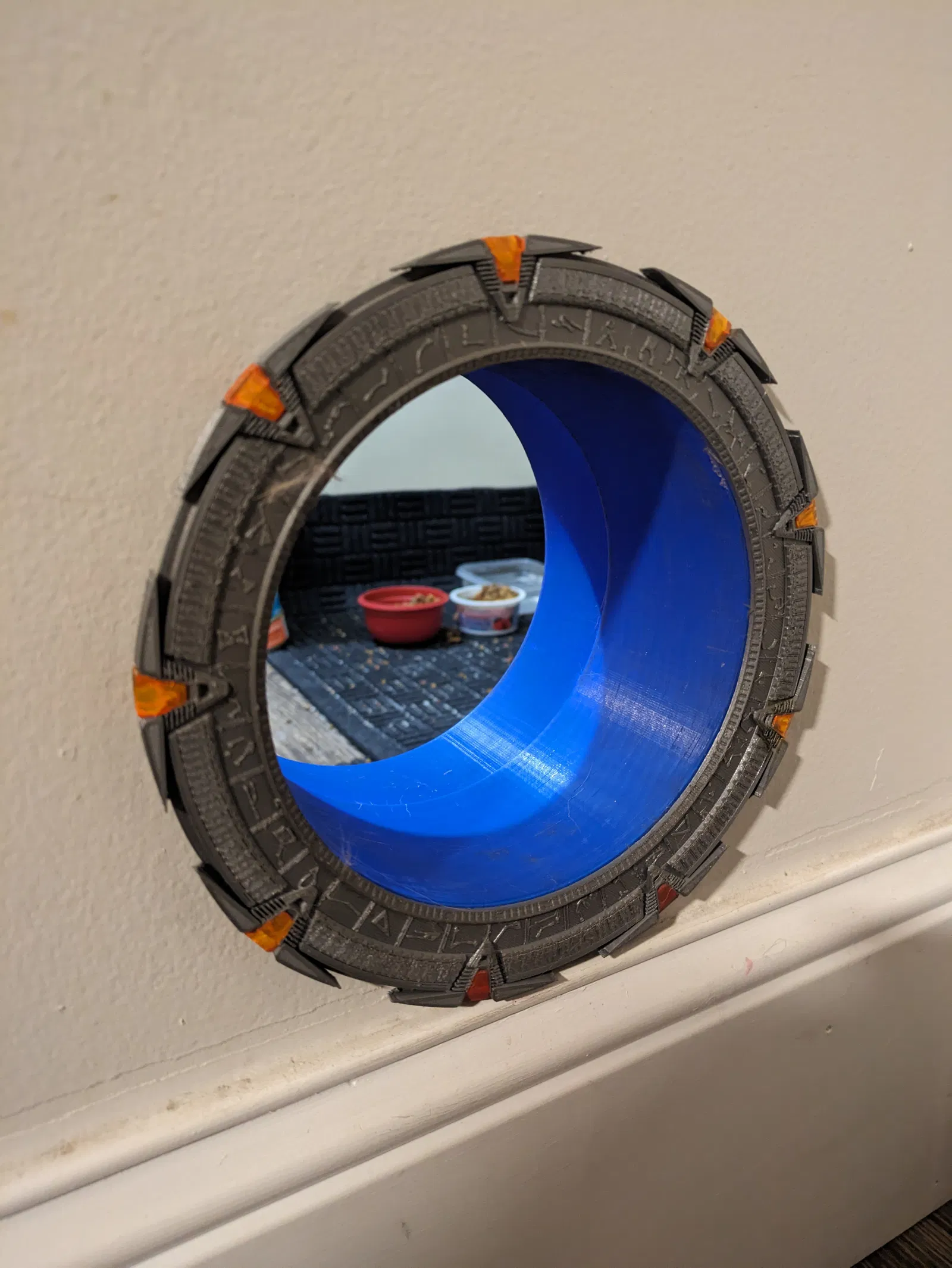 Có lẽ là để vinh danh một trong những chương trình TV yêu thích nhất của tôi, hoặc có lẽ với hy vọng rằng nó sẽ thực sự đưa những con mèo của tôi đến một nửa thiên hà để sử dụng hộp vệ sinh, dù bằng cách nào thì nó cũng làm tôi mỉm cười. (Những con mèo thì thờ ơ.) Cổng cho phép chúng tiếp cận tức thì tủ quần áo dưới gầm cầu thang nơi chúng tôi để thức ăn và hộp vệ sinh.