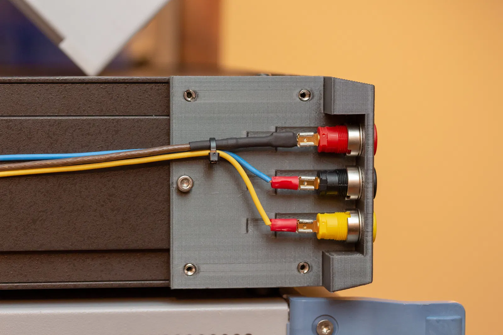 Bộ phận này cho phép bạn lắp các jack cắm 4mm vào mặt trước của bộ đo nguồn Keithley 236/237/238. Sử dụng jack Hirschmann 4mm, bản in đầu tiên được sản xuất bằng Polyamide (SLS) nhuộm màu Nâu, bóng mờ bởi i.materialise.