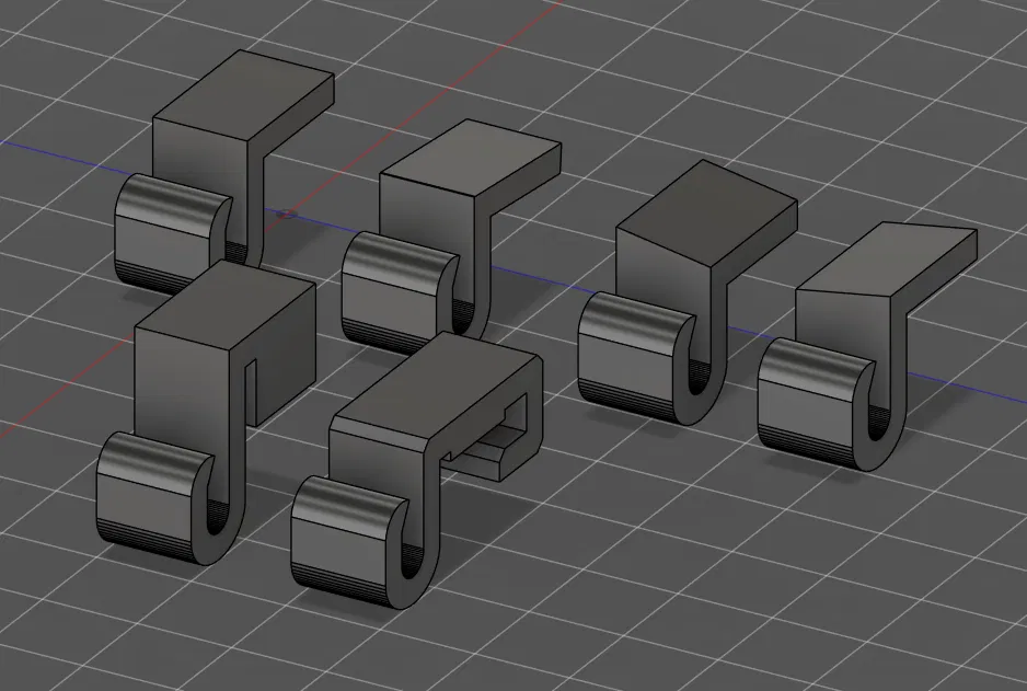 Góc thẳng, góc 85°, góc trái/phải cho các vị trí lên/xuống để giữ cho móc luôn thẳng đứng (góc sang trái/phải là 80,5°/99,5°). Phiên bản cuối cùng được làm cho phần phía trước của giàn hoa của chúng tôi, nơi có thể lắp đặt mà không cần băng dính hay bất cứ thứ gì khác, và phiên bản có phần che cho vị trí đầu tiên/cuối cùng, nơi cần thêm thứ gì đó đặc biệt. Có lẽ ai đó cũng sẽ tìm thấy công dụng cho nó.