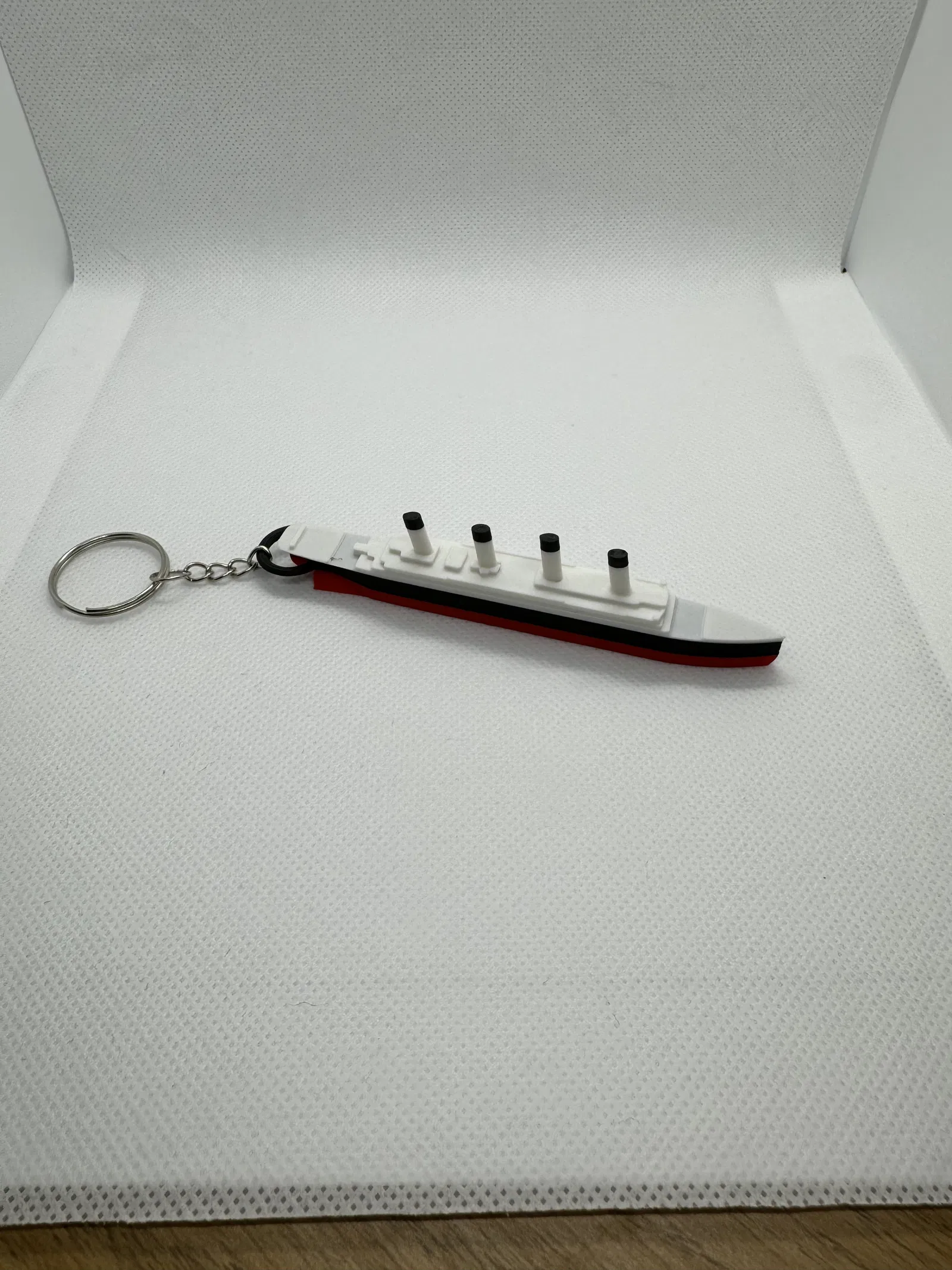 Móc khóa hình tàu Titanic, đã được bổ sung vòng lặp để dễ dàng gắn vào chìa khóa. Lưu ý: Phần vòng lặp của mô hình cần có vật liệu hỗ trợ khi in.