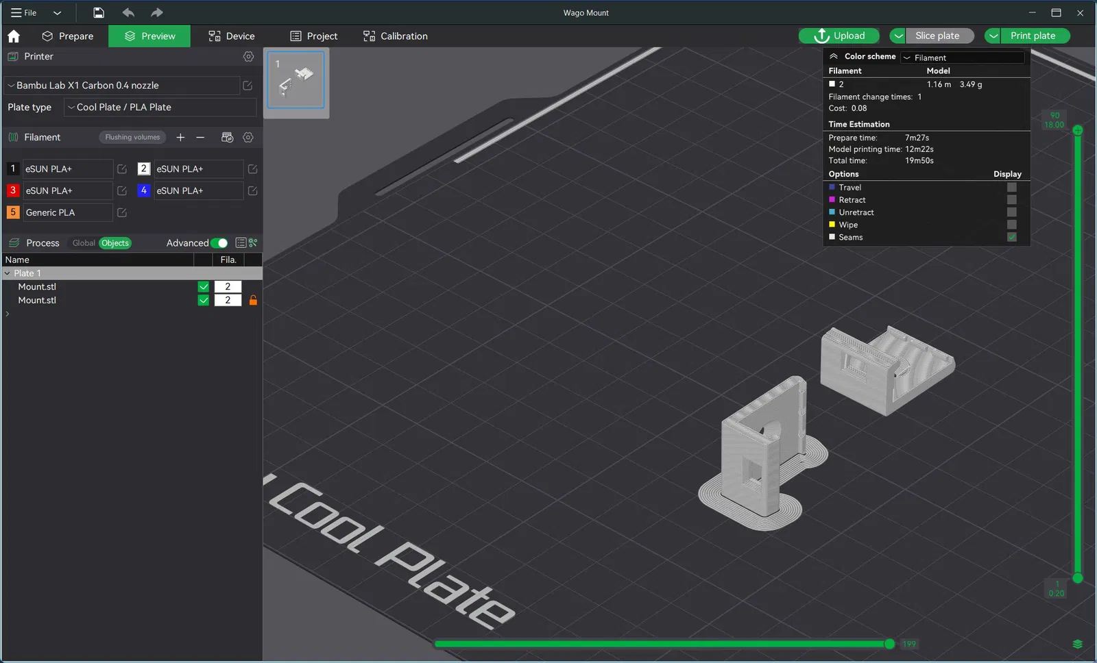 Bản in của tui được làm bằng sợi eSUN PLA+ 1.75mm màu cam, với độ dày lớp 0.2mm và 100% infill trên máy in Bambu X1 Carbon.