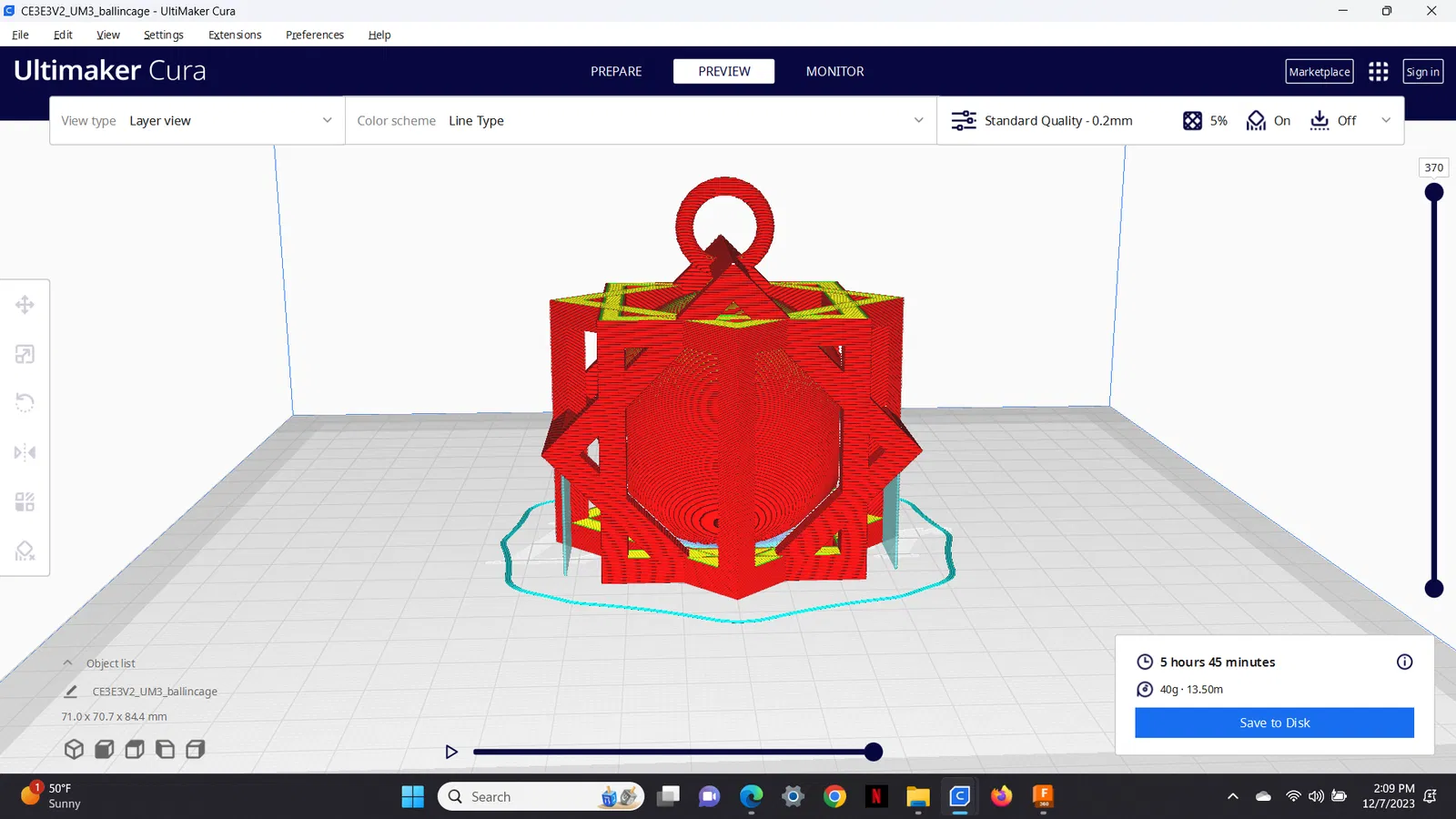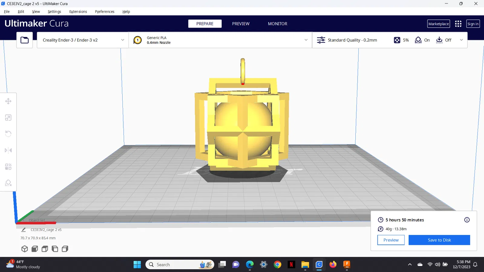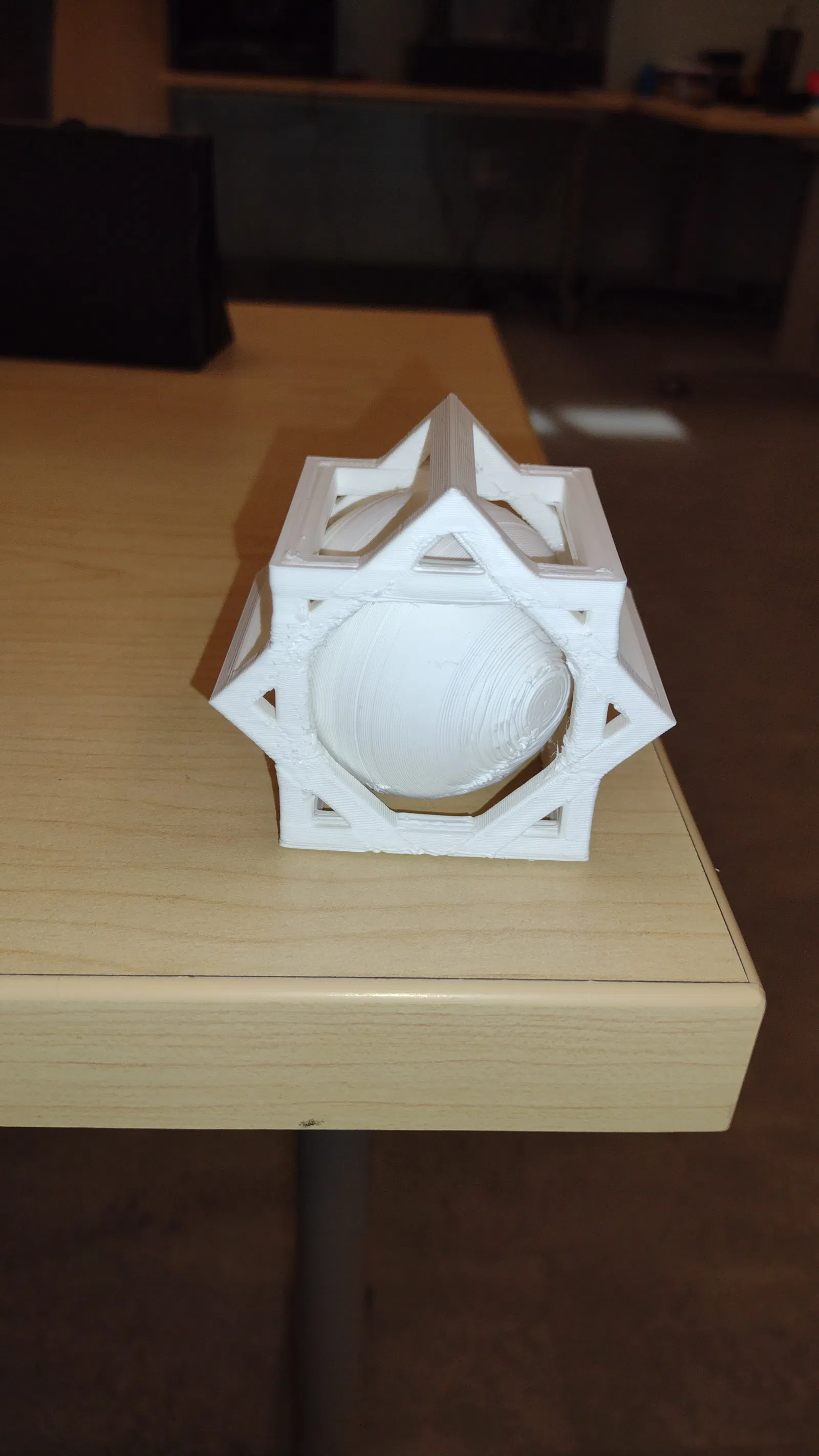 Trang trí Giáng sinh hình quả cầu đặt trong lồng. Mô hình này là vật trang trí bàn làm việc, có thể in bằng PLA màu trắng hoặc cầu vồng. Yêu cầu cấu trúc chống đỡ và độ dày ruột 5% để nhẹ.