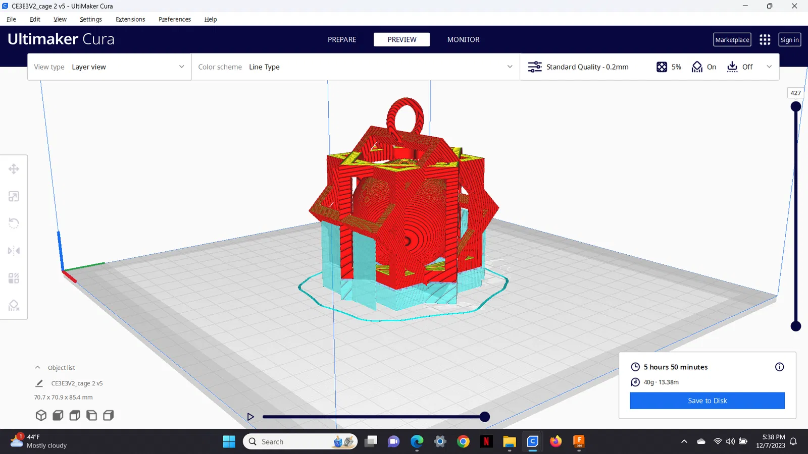 Độ dày ruột (infill) 5% để giữ cho mô hình nhẹ.
