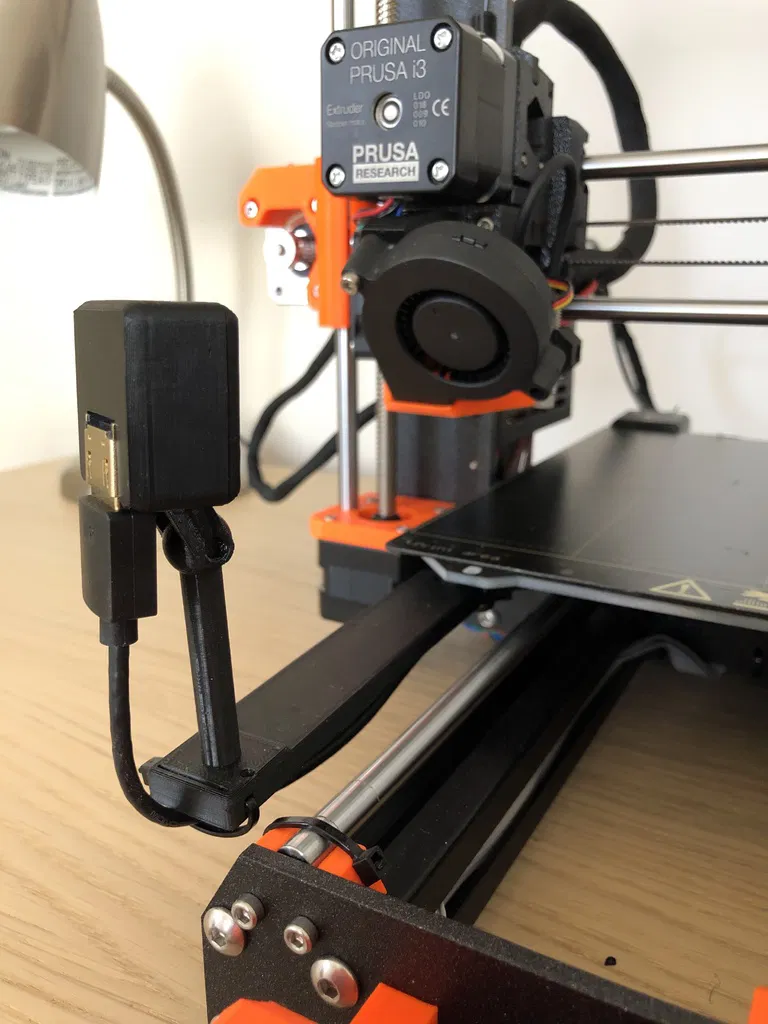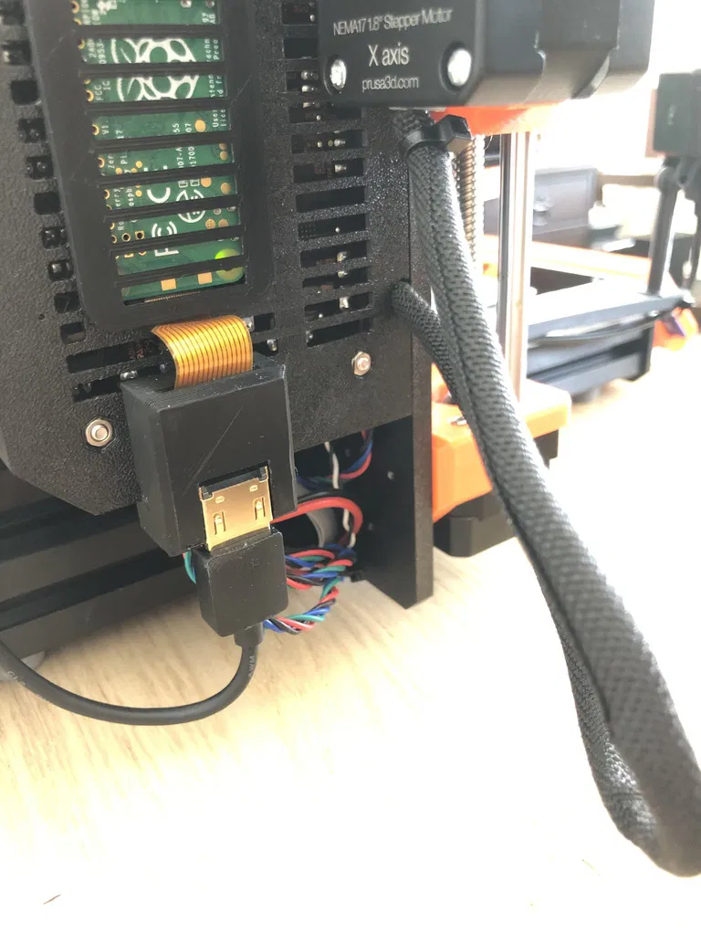 Điểm cộng bổ sung là khả năng gắn vào vỏ Einsy/Rambo của Prusa i3 MK3. Nếu bạn sử dụng RPi Zero với Prusa của mình, điều này sẽ giữ chặt đầu kia của bộ chuyển đổi HDMI sang ribbon. Tôi đã sử dụng cáp hdmi 3 feet để có độ vừa vặn hoàn hảo.